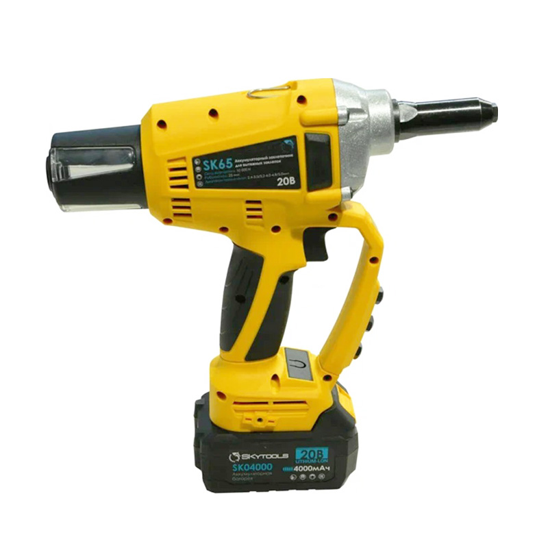 Аккумуляторный заклёпочник SK65, профессиональный инструмент для монтажа вытяжных заклепок из всех материалов изготовления, в диапазоне от 2,4 мм до 5,0 мм. Оснащен бесщеточным двигателем, что существенно продлевает ресурс работы инструмента и увеличивает его КПД. Сила вытягивания инструмента составляет 10 000 Н, рабочий ход 25 мм. Корпус инструмента выполнен из высококачественного пластика, рукоятка прорезинена. Так же спереди предусмотрена защита руки, на которой располагается удобная и яркая подсветка, а также размещены разные диаметры насадок для предусмотренного диапазона заклепок. Резервуар для оторванных стержней прорезинен, и имеет на тыльной стороне шестигранное отверстие, что позволяет легко вкручивать и выкручивать насадки.