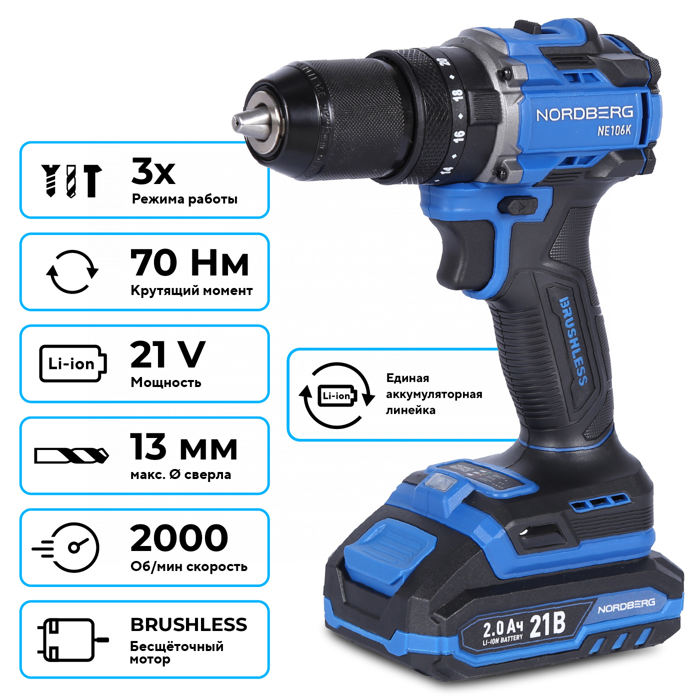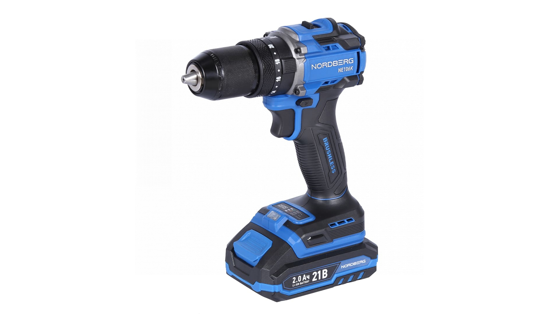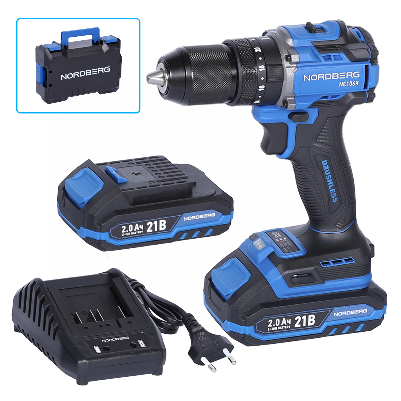 О товаре NORDBERG NE106K — аккумуляторный шуруповерт с высоким крутящим моментом. Используется в строительстве, ремонте и профессиональных мастерских. ФУНКЦИОНАЛ Предназначен для заворачивания и отворачивания винтов, шурупов, болтов, а также сверления отверстий в дереве, металле, пластике, керамике и бетоне. ПРЕИМУЩЕСТВА Крутящий момент – 70 Нм, что позволяет заворачивать шурупы и другой крепеж в материал высокой плотности, Двухскоростной режим 0–500 об/мин (I) / 0–2000 об/мин (II), для точного подбора скорости под разные задачи, Максимальный диаметр сверления 13 мм, подходит для работы с различными материалами, Два аккумулятора 21 В, 2 А·ч, увеличенное время работы без подзарядки, Бесщёточный мотор – увеличенный ресурс работы и сниженный нагрев, Быстрозажимной патрон – быстрая смена оснастки без дополнительных инструментов. УДОБСТВО ИСПОЛЬЗОВАНИЯ Удобный переключатель режимов скорости, Реверс и регулировка крутящего момента позволяют точно настраивать под разные типы крепежа, Компактный и легкий дизайн и прорезиненная рукоятка для комфортного хвата, LED-подсветка обеспечивает удобство работы при слабом освещении. КОМПЛЕКТАЦИЯ Шуруповерт – 1 шт, Аккумулятор 21 В / 2 А·ч – 2 шт, Зарядное устройство 21 В / 1,8 А – 1 шт, Инструкция по эксплуатации – 1 шт. NORDBERG NE106K — мощный, надежный и удобный в эксплуатации инструмент для профессионального и бытового использования. Показать полностью Скрыть Характеристики Максимальное усилие, Нм 70 Скорость свободного вращения, об/мин 2000 Количество скоростей 2 Размер патрона 13 Тип патрона быстрозажимной Наличие удара есть Подсветка есть Тип питания Li-ion аккумулятор Напряжение аккумулятора, В 21 Максимальная емкость аккумулятора, А·ч 2 Габариты, мм 165x75x23 Вес товара, кг 1,42 **Габариты и вес товара с упаковкой Общий вес с упаковкой - 3 кг Упаковка Размеры упаковки (Д*Ш*В), мм Вес, кг Упаковка №1 340 x 115 x 235 3 ** Теоретический вес