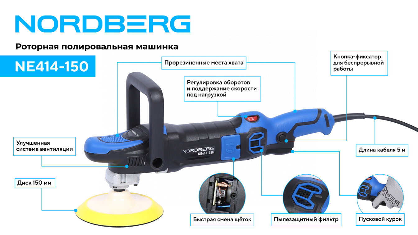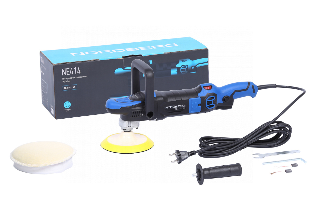 О товаре Полировальная машинка NORDBERG NE414-150 – электрический инструмент для выполнения профессиональных работ в автосервисах, студиях детейлинга и других предприятиях, занимающихся покраской. ФУНКЦИОНАЛ Предназначена для финишной полировки лакокрасочных покрытий автомобилей, а также для полировки различных материалов, таких как металл, пластик, дерево. ПРЕИМУЩЕСТВА И ОСОБЕННОСТИ Регулировка оборотов и поддержание оптимальной скорости оборотов под любой нагрузкой Кнопка-фиксатор позволяет удерживать курок для беспрерывной работы Быстрый доступ к смене щеток Пылезащитный фильтр Длина кабеля 5 метров Эргономичная прорезиненная рукоятка УДОБСТВО ИСПОЛЬЗОВАНИЯ Удобное использование благодаря простой конструкции и удобному дизайну. КОМПЛЕКТАЦИЯ полировальная шлифмашина подошва на липучке - 1 шт. рукоятка - 1 шт. шестигранный ключ - 1 шт. губка для полировки - 1 шт. угольная щетка - 1 комп. паспорт-инструкция Полировальная машинка NORDBERG NE414-150 подойдет для полировки различных материалов как в профессиональной сфере, так и в быту. Показать полностью Скрыть Характеристики Диаметр диска, мм 150 Скорость свободного вращения, об/мин 450 Максимальная скорость свободного вращения, об/мин 1950 Потребляемая мощность, Вт 1200 Крепление диска шпиндель Резьба шпинделя M14 Регулировка скоростей есть Длина кабеля, см 500 Напряжение, В 220 **Габариты и вес товара с упаковкой Общий вес с упаковкой - 3.409 кг Упаковка Размеры упаковки (Д*Ш*В), мм Вес, кг Упаковка №1 480 x 160 x 170 3.409 ** Теоретический вес