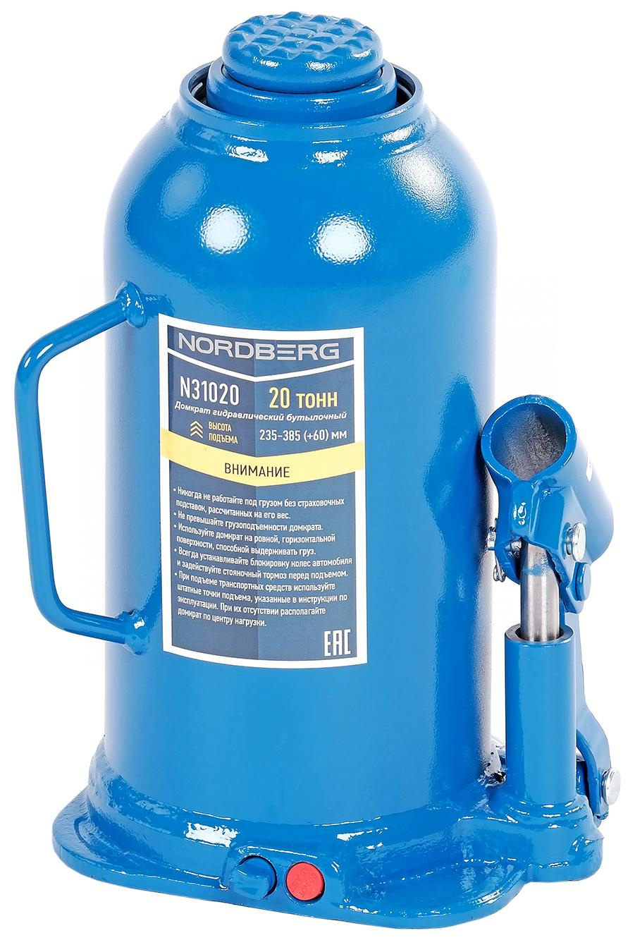 О товаре Домкрат бутылочный NORDBERG N31020 – профессиональное грузоподъемное оборудование для сервисных работ в автотранспортных предприятиях, автомастерских и СТО. ФУНКЦИОНАЛ Гидравлический домкрат с ручным приводом способен поднимать различные виды грузов и транспортных средств до 20 тонн, обеспечивая надежную и безопасную процедуру подъема. ПРЕИМУЩЕСТВА Грузоподъемность 20 т Плавный подъем груза при небольшом рабочем усилии оператора, обеспечивается оптимальной конструкцией гидравлической системы домкрата Выдвижной винт 6 см Могут быть использованы в качестве рабочего элемента в более сложных устройствах, таких как прессы, трубогибы и прочее, где рабочий элемент располагается вертикально или горизонтально Надежная эксплуатация УДОБСТВО ИСПОЛЬЗОВАНИЯ Простое использование Минимальное техническое обслуживание КОМПЛЕКТАЦИЯ Домкрат NORDBERG N31020 Рукоять Паспорт-инструкция Бутылочный домкрат NORDBERG N31020 – высококачественное силовое оборудование для выполнения подъемных работ при диагностике и ремонте автомобиля в автосервисах, шиномонтажах и автотранспортных предприятиях. Показать полностью Скрыть Характеристики Грузоподъемность максимальная, т 20 Минимальная высота подхвата, см 23,5 Максимальная высота подъема, см 44,5 Ход штока, см 15 Ход винта, см 6 Привод гидравлический Тип одноплунжерный **Габариты и вес товара с упаковкой Общий вес с упаковкой - 8.5 кг Упаковка Размеры упаковки (Д*Ш*В), мм Вес, кг Упаковка №1 170 x 150 x 255 8.5 ** Теоретический вес