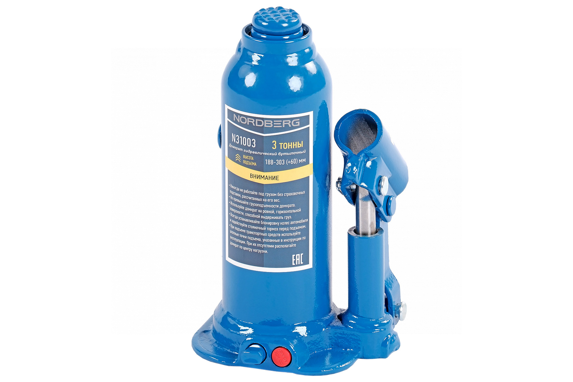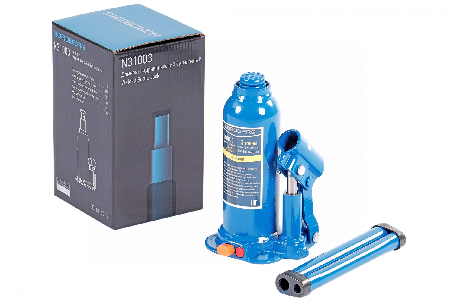 О товаре Домкрат бутылочный NORDBERG N31003 – профессиональное грузоподъемное оборудование для сервисных работ в автотранспортных предприятиях, автомастерских и СТО. ФУНКЦИОНАЛ Гидравлический домкрат с ручным приводом способен поднимать различные виды грузов и транспортных средств до 3 тонн, обеспечивая надежную и безопасную процедуру подъема. ПРЕИМУЩЕСТВА Грузоподъемность 3 т Плавный подъем груза при небольшом рабочем усилии оператора, обеспечивается оптимальной конструкцией гидравлической системы домкрата Выдвижной винт 6 см Могут быть использованы в качестве рабочего элемента в более сложных устройствах, таких как прессы, трубогибы и прочее, где рабочий элемент располагается вертикально или горизонтально Надежная эксплуатация УДОБСТВО ИСПОЛЬЗОВАНИЯ Простое использование Минимальное техническое обслуживание КОМПЛЕКТАЦИЯ Домкрат NORDBERG N31003 Рукоять Паспорт-инструкция Бутылочный домкрат NORDBERG N31003 – высококачественное силовое оборудование для выполнения подъемных работ при диагностике и ремонте автомобиля в автосервисах, шиномонтажах и автотранспортных предприятиях. Показать полностью Скрыть Характеристики Грузоподъемность максимальная, т 3 Минимальная высота подхвата, см 18,8 Максимальная высота подъема, см 36,3 Ход штока, см 11,5 Ход винта, см 6 Тип одноплунжерный Привод гидравлический **Габариты и вес товара с упаковкой Общий вес с упаковкой - 2.9 кг Упаковка Размеры упаковки (Д*Ш*В), мм Вес, кг Упаковка №1 123 x 117 x 203 2.9 ** Теоретический вес