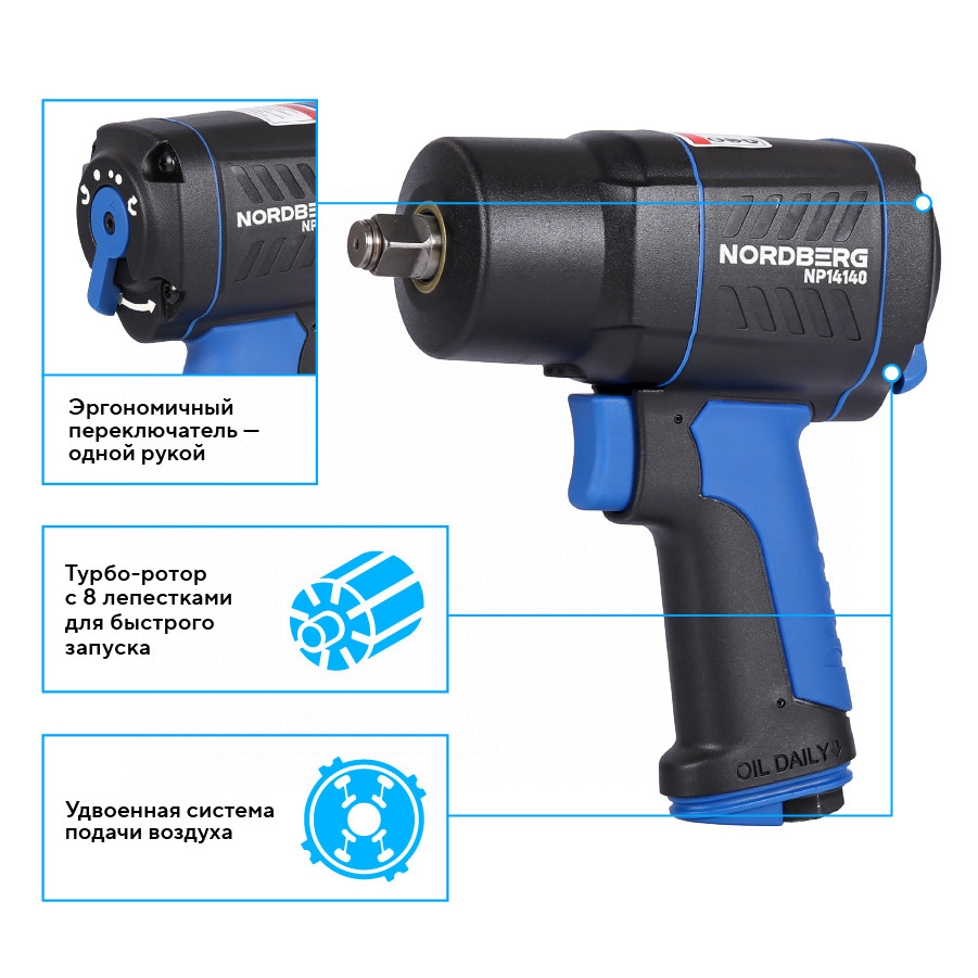 О товаре NORDBERG NP14140 — пневмогайковёрт ударный 1/2inch (Дюйм), 1550 Нм. ФУНКЦИОНАЛ Предназначен для откручивания и закручивания резьбовых соединений при ремонте и обслуживании автомобилей. ПРЕИМУЩЕСТВА Турбо-ротор с 8 лепестками — обеспечивает быстрый запуск двигателя и стабильную работу, Встроенная тавотница — удобная смазка ударного механизма для продления срока службы, Прочный корпус и эргономичная рукоятка из композитного материала с армированным стекловолокном — снижает вибрацию, защищает руку от холода и уменьшает усталость, 2 режима закручивания и 1 режим откручивания — точный контроль усилия для разных задач, Ударный механизм TWIN-HAMMER — быстро справляется с заклинившими и прикипевшими болтами, Компактность и лёгкость — всего 1,74 кг — комфортная работа даже при длительном использовании, Выход воздуха направлен вниз — предотвращает попадание масла и конденсата на рабочую поверхность. NORDBERG NP14140 — мощный, лёгкий и удобный пневмогайковёрт, идеально подходящий для автосервисов, шиномонтажей и гаражного применения. Показать полностью Скрыть Характеристики Диаметр впускного отверстия, дюйм 1/4 Посадочный квадрат, дюйм 1/2 Максимальное усилие, Нм 1550 Рабочее давление, бар 6 Скорость свободного вращения, об/мин 12 000 Среднее потребление воздуха, л/мин 170 Регулировка момента затяжки есть Тип ударного механизма TWIN-HAMMER Комплектация нет **Габариты и вес товара с упаковкой Общий вес с упаковкой - 2 кг Упаковка Размеры упаковки (Д*Ш*В), мм Вес, кг Упаковка №1 23 x 17 x 7 2 ** Теоретический вес