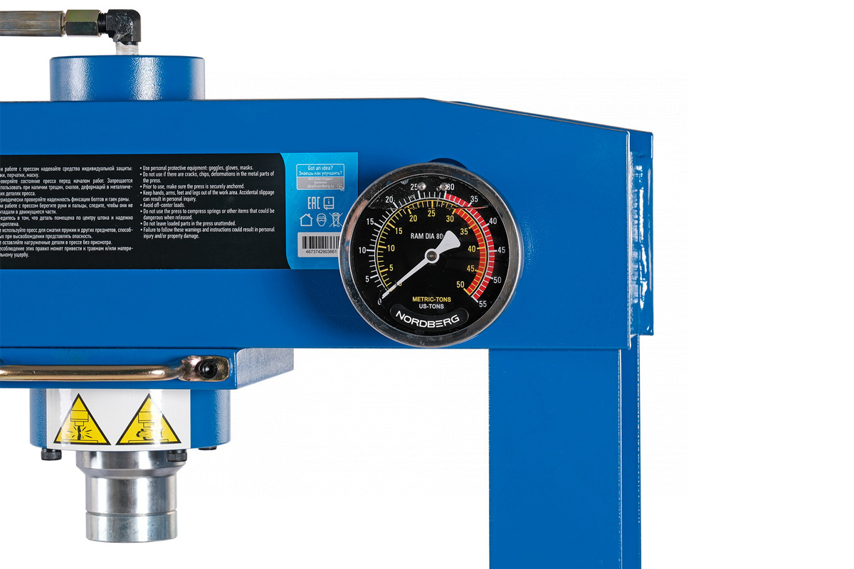 О товаре Гидравлический пресс с ручным и ножным приводом NORDBERG N3630F – оборудование для выполнения различных ремонтных работ в автосервисах и СТО. ФУНКЦИОНАЛ Используется при следующих ремонтно-монтажных работах: выпрессовки подшипников и втулок, правки валов, осей, профилей, для прессования заготовок. ПРЕИМУЩЕСТВА Максимальное усилие 30 тонн Надежная сварная рама обеспечивает устойчивость конструкции Возможность смещения гидравлического цилиндра Регулируемый рабочий стол Гидравлический насос с ручным приводом. Ножная педаль УДОБСТВО ИСПОЛЬЗОВАНИЯ Две пластины трапеции для надежного упора Манометр для контроля рабочего давления расположен на уровне глаз. КОМПЛЕКТАЦИЯ Гидравлический пресс NORDBERG N3630F Пластины трапеции Паспорт-инструкция Пресс гидравлический NORDBERG N3630F – незаменимое оборудование в автосервисах, гаражах, позволяющее эффективно и быстро выполнять различные ремонтные работы. Показать полностью Скрыть Характеристики Усилие, т 30 Ширина рабочего стола, мм 490 Глубина рабочего стола, мм 140 Минимальный подъем станины, мм 280 Максимальный подъем станины, мм 1310 Гидравлический ход, мм 150 Привод насоса ручной + педаль Исполнение напольный Объем масла, мл 1400 Максимальный рабочий диапазон, мм 1031 Горизонтальное смещение, мм 360 **Габариты и вес товара с упаковкой Общий вес с упаковкой - 203 кг Упаковка Размеры упаковки (Д*Ш*В), мм Вес, кг Упаковка №1 780 x 1920 x 270 203 ** Теоретический вес