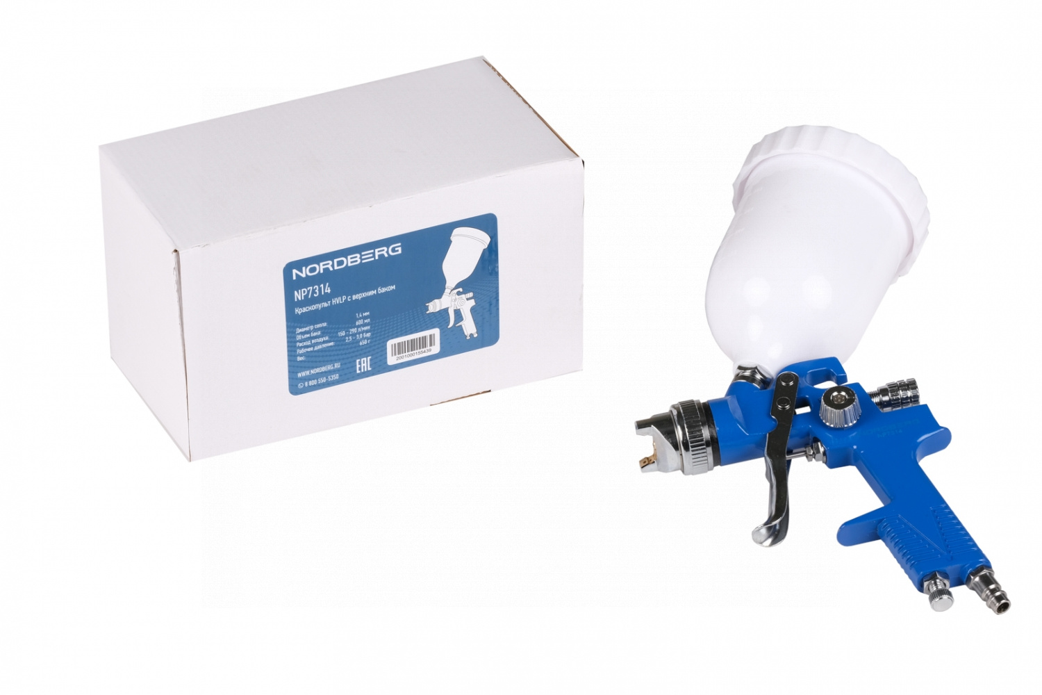 О товаре NORDBERG КРАСКОПУЛЬТ NP7314 HVLP с верхним баком, сопло 1,4 мм Описание: Краскопульты Nordberg NP7320 предназначены для нанесения лакокрасочных материалов, в том числе на водной основе, для получения высококачественных финиш-покрытий. Не пригодны для работы с абразивными материалами и составами , содержащими кислоты и бензин. Краскопульты серии HVLP (High Volume Low Pressure) используют технологию высокого расхода воздуха при низком давлении. Эта технология позволяет снизить количество аэрозольного тумана (за счет низкого давления в распыляющей головке, около 0,7 Бар) и соответственно увеличить коэффициент переноса материала по сравнению с обычными краскопультами до 65-70%. Особенности: Для удобства хранения инструмента предусмотрено отверстие для подвеса Большой рабочий ресурс Возможность длительной работы без остановки Устойчивость к перегрузкам и перегреву Комплектация: Краскопульт Ключ для разборки Щетка для чистки Сменный фильтр Быстросъемный переходник Инструкция Показать полностью Скрыть Характеристики Объем бачка, мл 600 Среднее потребление воздуха, л/мин 150 Максимальный расход воздуха, л/мин 290 Сопло, мм 1,4 Рабочее давление, бар 2,5 Максимальное рабочее давление, бар 3 Способ распыления HVLP Материал бачка пластик Расположение бачка верхнее Тип соединения рапид Вес, г 650 **Габариты и вес товара с упаковкой Общий вес с упаковкой - 0.85 кг Упаковка Размеры упаковки (Д*Ш*В), мм Вес, кг Упаковка №1 230 x 130 x 120 0.85 ** Теоретический вес