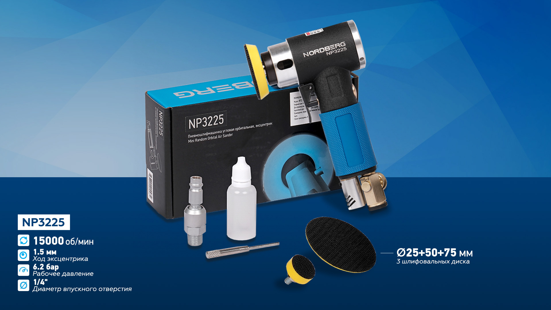 О товаре Пневматическая шлифовальная машинка для шлифования, полировки или удаления старых лакокрасочных покрытий NORDBERG NP3225 – специализированное оборудование для автосервисов, станций шиномонтажа и автотранспортных предприятий. ФУНКЦИОНАЛ Предназначена для шлифования, полировки или удаления старых лакокрасочных покрытий. ПРЕИМУЩЕСТВА Три сменных диска диаметром позволяют эффективно и безопасно обработать поверхность. Металлический корпус, защищенный эластичной накладкой. Шарнирное пневмосоединение в комплекте. УДОБСТВО ИСПОЛЬЗОВАНИЯ Пневмошлифмашинка значительно сокращает временные издержки на очистку поверхностей. Она компактна, умещается в одной руке и за счет шарнирного пневмосоединения минимизирует неудобство от натяжения шланга подачи сжатого воздуха, а эластичная накладка на корпусе улучшает контакт с ним, чем достигается удобство и производительность при обработке поверхностей. КОМПЛЕКТАЦИЯ пневмошлифмашинка NORDBERG NP3225 шлифовальные диски 3 шт. 25 мм, 50 мм, 75 мм Фиксатор для смены диска - 1 шт. быстросъемный переходник - 1 шт. маслёнка (без масла) паспорт-инструкция Пневматическая шлифовальная машинка NORDBERG NP3225 позволит бережно и эффективно очистить различные автомобильные детали. Показать полностью Скрыть Характеристики Диаметр впускного отверстия, дюйм 1/4 Рабочее давление, бар 6,2 Среднее потребление воздуха, л/мин 140 Скорость свободного вращения, об/мин 15000 Диаметр диска, мм 75 Крепление диска липучка **Габариты и вес товара с упаковкой Общий вес с упаковкой - 0.7 кг Упаковка Размеры упаковки (Д*Ш*В), мм Вес, кг Упаковка №1 193 x 107 x 50 0.7 ** Теоретический вес