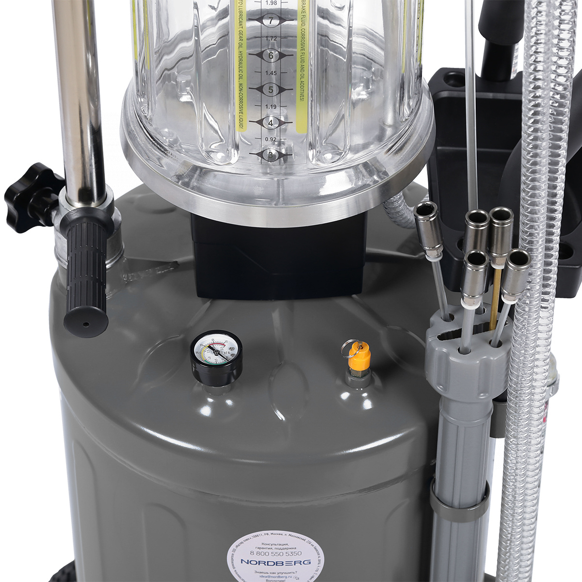 О товаре Установка для замены масла NORDBERG (2380) 2380G удаляет отработанное масло и другие жидкости из любого транспортного средства при помощи вентури-вакуумной вытяжной системы. Используется как сливное устройство со свободным сливом отработанного масла из двигателей, коробок передач и дифференциалов всех транспортных средств. Установка портативна и проста в эксплуатации. Включает шесть щупов (металлических и гибких), оборудованных быстро разъединяющимися муфтами (наконечниками) для извлечения жидкости. В комплект системы входят адаптеры для автомобилей BMW и Volkswagen. Регулируемая воронка для сбора масла устанавливается на необходимой для работы высоте при помощи прижимного винта. Оборудование укомплектовано краном в воронке для сбора масла, для контроля состояния сливаемого масла перед началом слива в резервуар. Возможность самоочистки делает работу с устройством чистой и легкой. Осмотровая колба позволяет визуально оценить качество отработанного масла, имеющиеся недостатки двигателя и т.п. Показать полностью Скрыть Характеристики Объем бака, л 80 Рабочее давление, бар 6,2 Максимальная высота, мм 1780 Минимальная высота, мм 1025 **Габариты и вес товара с упаковкой Общий вес с упаковкой - 36.5 кг Упаковка Размеры упаковки (Д*Ш*В), мм Вес, кг Упаковка №1 550 x 450 x 1480 36.5 ** Теоретический вес
