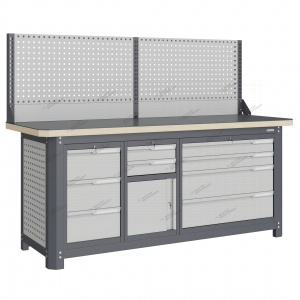 Рама верстака выполнена их холоднокатаной стали. Опоры допускают частичную регулировку по высоте для компенсации неровности пола. Все металлические элементы покрыты полиэфирной порошковой краской, обеспечивающей хорошую износостойкость покрытия и невосприимчивость его к моющим средствам и смазочным веществам. Верстак имеет декларацию соответствия ТР ТС 025/2012 «О безопасности мебельной продукции». Верстак имеет сертификат соответствия ГОСТ Р 58863-2020 «Столы производственные. Верстаки из металла. Общие технические условия». Столешница состоит из листа влагостойкой фанеры марки ФСФ толщиной 40 мм, которая покрыта лаком-антисептиком и листом горячекатаной стали толщиной 5 мм. Глубина столешниц 743 мм. Максимальная масса груза, равномерно распределенного по столешнице, составляет 1500 кг. Модуль верстака выполнен сварными. Ящики в модулях устанавливаются на шариковых телескопических направляющих полного выдвижения. В модуле S3 установлено три больших ящика. Внутренние размеры больших ящиков (ВхШхГ), не более: 172 х 340 х 500 мм. Максимально допустимая масса груза, равномерно распределенного по поверхности любого выдвижного ящика 31 кг. В модуле S9 установлено два малых ящика, дверь и одна полка. Внутренние размеры малого ящика (ВхШхГ), не более: 75 х 340 х 500 мм. Дверь имеет размеры (ВхШхГ), не более: 346 х 367 х 25 мм. Полка модуля имеет размеры (ВхШхГ), не более: 25 х 367 х 510 мм. Максимально допустимая масса груза, равномерно распределенного по поверхности любого выдвижного ящика и полки 31 кг. В модуле L4 установлено два малых ящика и два больших ящика. Внутренние размеры малых ящиков (ВхШхГ), не более: 75 х 755 х 500 мм. Внутренние размеры больших ящиков (ВхШхГ), не более: 172 х 755 х 500 мм. Максимально допустимая масса груза, равномерно распределенного по поверхности любого выдвижного ящика 31 кг. Модули с ящиками снабжены общим центральным замком с поворотом ригеля 180 градусов и подпружиненной тягой. В комплекте два ключа для каждого замка. Квадратная перфорация на элементах верстака предназначена для установки крючков, держателей и других аксессуаров, имеет размеры: квадрат 12х12мм. шаг 38мм. Экран (перфорированная панель) верстака выполнен с квадратной перфорацией 12х12 мм с шагом 38 мм для установки крючков, держателей и других аксессуаров. Экран крепятся к столешнице с помощью специальных кронштейнов. Максимальная масса груза, равномерно распределенного по поверхности экрана, составляет 71 кг. Характеристики **Габариты и вес товара с упаковкой Общий вес с упаковкой - 0 кг Упаковка Размеры упаковки (Д*Ш*В), мм Вес, кг Упаковка №1 x x 0 ** Теоретический вес