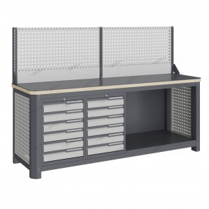 Рама верстака выполнена их холоднокатаной стали. Опоры допускают частичную регулировку по высоте для компенсации неровности пола. Все металлические элементы покрыты полиэфирной порошковой краской, обеспечивающей хорошую износостойкость покрытия и невосприимчивость его к моющим средствам и смазочным веществам. Верстак имеет декларацию соответствия ТР ТС 025/2012 «О безопасности мебельной продукции». Верстак имеет сертификат соответствия ГОСТ Р 58863-2020 «Столы производственные. Верстаки из металла. Общие технические условия». Столешница состоит из листа влагостойкой фанеры марки ФСФ толщиной 40 мм, которая покрыта лаком-антисептиком и листом горячекатаной стали толщиной 5 мм. Глубина столешниц 743 мм. Максимальная масса груза, равномерно распределенного по столешнице, составляет 1500 кг. Модуль верстака выполнен сварными. Ящики в модулях устанавливаются на шариковых телескопических направляющих полного выдвижения. В модуле S6 установлено шесть малых ящиков. Внутренние размеры малых ящиков (ВхШхГ), не более: 75 х 340 х 500 мм. Максимально допустимая масса груза, равномерно распределенного по поверхности любого выдвижного ящика 31 кг. Комплект полка-стенка SW1. Размеры полки (ВхШхГ), не более: 35 х 415 х 619 мм. Размеры стенки (ВхШхГ), не более: 652 х 415 х 25 мм. Максимально допустимая масса груза, равномерно распределенного по поверхности полки 31 кг. Модули с ящиками снабжены общим центральным замком с поворотом ригеля 180 градусов и подпружиненной тягой. В комплекте два ключа для каждого замка. Квадратная перфорация на элементах верстака предназначена для установки крючков, держателей и других аксессуаров, имеет размеры: квадрат 12х12мм. шаг 38мм. Экран (перфорированная панель) верстака выполнен с квадратной перфорацией 12х12 мм с шагом 38 мм для установки крючков, держателей и других аксессуаров. Экран крепятся к столешнице с помощью специальных кронштейнов. Максимальная масса груза, равномерно распределенного по поверхности экрана, составляет 71 кг. Характеристики **Габариты и вес товара с упаковкой Общий вес с упаковкой - 0 кг Упаковка Размеры упаковки (Д*Ш*В), мм Вес, кг Упаковка №1 x x 0 ** Теоретический вес