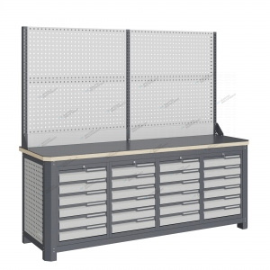Рама верстака выполнена их холоднокатаной стали. Опоры допускают частичную регулировку по высоте для компенсации неровности пола. Все металлические элементы покрыты полиэфирной порошковой краской, обеспечивающей хорошую износостойкость покрытия и невосприимчивость его к моющим средствам и смазочным веществам. Верстак имеет декларацию соответствия ТР ТС 025/2012 «О безопасности мебельной продукции». Верстак имеет сертификат соответствия ГОСТ Р 58863-2020 «Столы производственные. Верстаки из металла. Общие технические условия». Столешница состоит из листа влагостойкой фанеры марки ФСФ толщиной 40 мм, которая покрыта лаком-антисептиком и листом горячекатаной стали толщиной 5 мм. Глубина столешниц 743 мм. Максимальная масса груза, равномерно распределенного по столешнице, составляет 1500 кг. Модуль верстака выполнен сварными. Ящики в модулях устанавливаются на шариковых телескопических направляющих полного выдвижения. В модуле S6 установлено шесть малых ящиков. Внутренние размеры малых ящиков (ВхШхГ), не более: 75 х 340 х 500 мм. Максимально допустимая масса груза, равномерно распределенного по поверхности любого выдвижного ящика 31 кг. Модули с ящиками снабжены общим центральным замком с поворотом ригеля 180 градусов и подпружиненной тягой. В комплекте два ключа для каждого замка. Квадратная перфорация на элементах верстака предназначена для установки крючков, держателей и других аксессуаров, имеет размеры: квадрат 12х12мм. шаг 38мм. Экран (перфорированная панель) верстака выполнен с квадратной перфорацией 12х12 мм с шагом 38 мм для установки крючков, держателей и других аксессуаров. Экран крепятся к столешнице с помощью специальных кронштейнов. Максимальная масса груза, равномерно распределенного по поверхности экрана, составляет 71 кг. Характеристики **Габариты и вес товара с упаковкой Общий вес с упаковкой - 0 кг Упаковка Размеры упаковки (Д*Ш*В), мм Вес, кг Упаковка №1 x x 0 ** Теоретический вес