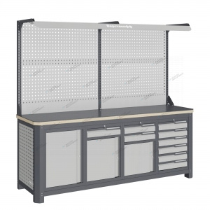 Рама верстака выполнена их холоднокатаной стали. Опоры допускают частичную регулировку по высоте для компенсации неровности пола. Все металлические элементы покрыты полиэфирной порошковой краской, обеспечивающей хорошую износостойкость покрытия и невосприимчивость его к моющим средствам и смазочным веществам. Верстак имеет декларацию соответствия ТР ТС 025/2012 «О безопасности мебельной продукции». Верстак имеет сертификат соответствия ГОСТ Р 58863-2020 «Столы производственные. Верстаки из металла. Общие технические условия». Столешница состоит из листа влагостойкой фанеры марки ФСФ толщиной 40 мм, которая покрыта лаком-антисептиком и листом горячекатаной стали толщиной 5 мм. Глубина столешниц 743 мм. Максимальная масса груза, равномерно распределенного по столешнице, составляет 1500 кг. Модуль верстака выполнен сварными. Ящики в модулях устанавливаются на шариковых телескопических направляющих полного выдвижения. В модуле S6 установлено шесть малых ящиков. Внутренние размеры малых ящиков (ВхШхГ), не более: 75 х 340 х 500 мм. Максимально допустимая масса груза, равномерно распределенного по поверхности любого выдвижного ящика 31 кг. В модуле S7 установлена дверь и две полки. Дверь имеет размеры (ВхШхГ), не более: 578 х 367 х 25 мм. Полка модуля имеет размеры (ВхШхГ), не более: 25 х 367 х 510 мм. Максимально допустимая масса груза, равномерно распределенного по поверхности полки 31 кг. В модуле S8 установлено один малый ящик и дверца. Внутренние размеры малого ящика (ВхШхГ), не более: 75 х 755 х 500 мм. Максимально допустимая масса груза, равномерно распределенного по поверхности любого выдвижного ящика 31 кг. Полка модуля имеет размеры (ВхШхГ), не более: 25 х 367 х 510 мм. Максимально допустимая масса груза, равномерно распределенного по поверхности полки 31 кг. В модуле S9 установлено два малых ящика, дверь и одна полка. Внутренние размеры малого ящика (ВхШхГ), не более: 75 х 340 х 500 мм. Дверь имеет размеры (ВхШхГ), не более: 346 х 367 х 25 мм. Полка модуля имеет размеры (ВхШхГ), не более: 25 х 367 х 510 мм. Максимально допустимая масса груза, равномерно распределенного по поверхности любого выдвижного ящика и полки 31 кг. Модули с ящиками снабжены общим центральным замком с поворотом ригеля 180 градусов и подпружиненной тягой. В комплекте два ключа для каждого замка. Квадратная перфорация на элементах верстака предназначена для установки крючков, держателей и других аксессуаров, имеет размеры: квадрат 12х12мм. шаг 38мм. Экран (перфорированная панель) верстака выполнен с квадратной перфорацией 12х12 мм с шагом 38 мм для установки крючков, держателей и других аксессуаров. Экран крепятся к столешнице с помощью специальных кронштейнов. Максимальная масса груза, равномерно распределенного по поверхности экрана, составляет 71 кг. Комплект освещения устанавливается над верстаком. В комплекте идет защитный козырек, кронштейны и лампа с магнитными креплениями, которые позволяют менять ее положение. Характеристики **Габариты и вес товара с упаковкой Общий вес с упаковкой - 0 кг Упаковка Размеры упаковки (Д*Ш*В), мм Вес, кг Упаковка №1 x x 0 ** Теоретический вес