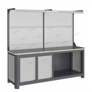 Рама верстака выполнена их холоднокатаной стали. Опоры допускают частичную регулировку по высоте для компенсации неровности пола. Все металлические элементы покрыты полиэфирной порошковой краской, обеспечивающей хорошую износостойкость покрытия и невосприимчивость его к моющим средствам и смазочным веществам. Верстак имеет декларацию соответствия ТР ТС 025/2012 «О безопасности мебельной продукции». Верстак имеет сертификат соответствия ГОСТ Р 58863-2020 «Столы производственные. Верстаки из металла. Общие технические условия». Столешница состоит из листа влагостойкой фанеры марки ФСФ толщиной 40 мм, которая покрыта лаком-антисептиком и листом горячекатаной стали толщиной 5 мм. Глубина столешниц 743 мм. Максимальная масса груза, равномерно распределенного по столешнице, составляет 1500 кг. Модуль верстака выполнен сварными. Ящики в модулях устанавливаются на шариковых телескопических направляющих полного выдвижения. В модуле S7 установлена дверь и две полки. Дверь имеет размеры (ВхШхГ), не более: 578 х 367 х 25 мм. Полка модуля имеет размеры (ВхШхГ), не более: 25 х 367 х 510 мм. Максимально допустимая масса груза, равномерно распределенного по поверхности полки 31 кг. Комплект полка-стенка SW1. Размеры полки (ВхШхГ), не более: 35 х 415 х 619 мм. Размеры стенки (ВхШхГ), не более: 652 х 415 х 25 мм. Максимально допустимая масса груза, равномерно распределенного по поверхности полки 31 кг. Модули с ящиками снабжены общим центральным замком с поворотом ригеля 180 градусов и подпружиненной тягой. В комплекте два ключа для каждого замка. Квадратная перфорация на элементах верстака предназначена для установки крючков, держателей и других аксессуаров, имеет размеры: квадрат 12х12мм. шаг 38мм. Экран (перфорированная панель) верстака выполнен с квадратной перфорацией 12х12 мм с шагом 38 мм для установки крючков, держателей и других аксессуаров. Экран крепятся к столешнице с помощью специальных кронштейнов. Максимальная масса груза, равномерно распределенного по поверхности экрана, составляет 71 кг. Комплект полка-стенка SW1. Размеры полки (ВхШхГ), не более: 35 х 415 х 619 мм. Размеры стенки (ВхШхГ), не более: 652 х 415 х 25 мм. Максимально допустимая масса груза, равномерно распределенного по поверхности полки 31 кг. Характеристики **Габариты и вес товара с упаковкой Общий вес с упаковкой - 0 кг Упаковка Размеры упаковки (Д*Ш*В), мм Вес, кг Упаковка №1 x x 0 ** Теоретический вес