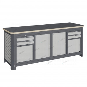Рама верстака выполнена их холоднокатаной стали. Опоры допускают частичную регулировку по высоте для компенсации неровности пола. Все металлические элементы покрыты полиэфирной порошковой краской, обеспечивающей хорошую износостойкость покрытия и невосприимчивость его к моющим средствам и смазочным веществам. Верстак имеет декларацию соответствия ТР ТС 025/2012 «О безопасности мебельной продукции». Верстак имеет сертификат соответствия ГОСТ Р 58863-2020 «Столы производственные. Верстаки из металла. Общие технические условия». Столешница состоит из листа влагостойкой фанеры марки ФСФ толщиной 40 мм, которая покрыта лаком-антисептиком и листом горячекатаной стали толщиной 5 мм. Глубина столешниц 743 мм. Максимальная масса груза, равномерно распределенного по столешнице, составляет 1500 кг. Модуль верстака выполнен сварными. Ящики в модулях устанавливаются на шариковых телескопических направляющих полного выдвижения. В модуле S7 установлена дверь и две полки. Дверь имеет размеры (ВхШхГ), не более: 578 х 367 х 25 мм. Полка модуля имеет размеры (ВхШхГ), не более: 25 х 367 х 510 мм. Максимально допустимая масса груза, равномерно распределенного по поверхности полки 31 кг. В модуле S9 установлено два малых ящика, дверь и одна полка. Внутренние размеры малого ящика (ВхШхГ), не более: 75 х 340 х 500 мм. Дверь имеет размеры (ВхШхГ), не более: 346 х 367 х 25 мм. Полка модуля имеет размеры (ВхШхГ), не более: 25 х 367 х 510 мм. Максимально допустимая масса груза, равномерно распределенного по поверхности любого выдвижного ящика и полки 31 кг. Модули с ящиками снабжены общим центральным замком с поворотом ригеля 180 градусов и подпружиненной тягой. В комплекте два ключа для каждого замка. Квадратная перфорация на элементах верстака предназначена для установки крючков, держателей и других аксессуаров, имеет размеры: квадрат 12х12мм. шаг 38мм. Характеристики **Габариты и вес товара с упаковкой Общий вес с упаковкой - 0 кг Упаковка Размеры упаковки (Д*Ш*В), мм Вес, кг Упаковка №1 x x 0 ** Теоретический вес