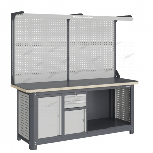 Рама верстака выполнена их холоднокатаной стали. Опоры допускают частичную регулировку по высоте для компенсации неровности пола. Все металлические элементы покрыты полиэфирной порошковой краской, обеспечивающей хорошую износостойкость покрытия и невосприимчивость его к моющим средствам и смазочным веществам. Верстак имеет декларацию соответствия ТР ТС 025/2012 «О безопасности мебельной продукции». Верстак имеет сертификат соответствия ГОСТ Р 58863-2020 «Столы производственные. Верстаки из металла. Общие технические условия». Столешница состоит из листа влагостойкой фанеры марки ФСФ толщиной 40 мм, которая покрыта лаком-антисептиком и листом горячекатаной стали толщиной 5 мм. Глубина столешниц 743 мм. Максимальная масса груза, равномерно распределенного по столешнице, составляет 1500 кг. Модуль верстака выполнен сварными. Ящики в модулях устанавливаются на шариковых телескопических направляющих полного выдвижения. В модуле S7 установлена дверь и две полки. Дверь имеет размеры (ВхШхГ), не более: 578 х 367 х 25 мм. Полка модуля имеет размеры (ВхШхГ), не более: 25 х 367 х 510 мм. Максимально допустимая масса груза, равномерно распределенного по поверхности полки 31 кг. В модуле S9 установлено два малых ящика, дверь и одна полка. Внутренние размеры малого ящика (ВхШхГ), не более: 75 х 340 х 500 мм. Дверь имеет размеры (ВхШхГ), не более: 346 х 367 х 25 мм. Полка модуля имеет размеры (ВхШхГ), не более: 25 х 367 х 510 мм. Максимально допустимая масса груза, равномерно распределенного по поверхности любого выдвижного ящика и полки 31 кг. Комплект полка-стенка SW1. Размеры полки (ВхШхГ), не более: 35 х 415 х 619 мм. Размеры стенки (ВхШхГ), не более: 652 х 415 х 25 мм. Максимально допустимая масса груза, равномерно распределенного по поверхности полки 31 кг. Модули с ящиками снабжены общим центральным замком с поворотом ригеля 180 градусов и подпружиненной тягой. В комплекте два ключа для каждого замка. Квадратная перфорация на элементах верстака предназначена для установки крючков, держателей и других аксессуаров, имеет размеры: квадрат 12х12мм. шаг 38мм. Экран (перфорированная панель) верстака выполнен с квадратной перфорацией 12х12 мм с шагом 38 мм для установки крючков, держателей и других аксессуаров. Экран крепятся к столешнице с помощью специальных кронштейнов. Максимальная масса груза, равномерно распределенного по поверхности экрана, составляет 71 кг. Комплект освещения устанавливается над верстаком. В комплекте идет защитный козырек, кронштейны и лампа с магнитными креплениями, которые позволяют менять ее положение. Характеристики **Габариты и вес товара с упаковкой Общий вес с упаковкой - 0 кг Упаковка Размеры упаковки (Д*Ш*В), мм Вес, кг Упаковка №1 x x 0 ** Теоретический вес