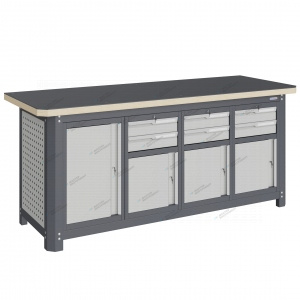 Рама верстака выполнена их холоднокатаной стали. Опоры допускают частичную регулировку по высоте для компенсации неровности пола. Все металлические элементы покрыты полиэфирной порошковой краской, обеспечивающей хорошую износостойкость покрытия и невосприимчивость его к моющим средствам и смазочным веществам. Верстак имеет декларацию соответствия ТР ТС 025/2012 «О безопасности мебельной продукции». Верстак имеет сертификат соответствия ГОСТ Р 58863-2020 «Столы производственные. Верстаки из металла. Общие технические условия». Столешница состоит из листа влагостойкой фанеры марки ФСФ толщиной 40 мм, которая покрыта лаком-антисептиком и листом горячекатаной стали толщиной 5 мм. Глубина столешниц 743 мм. Максимальная масса груза, равномерно распределенного по столешнице, составляет 1500 кг. Модуль верстака выполнен сварными. Ящики в модулях устанавливаются на шариковых телескопических направляющих полного выдвижения. В модуле S7 установлена дверь и две полки. Дверь имеет размеры (ВхШхГ), не более: 578 х 367 х 25 мм. Полка модуля имеет размеры (ВхШхГ), не более: 25 х 367 х 510 мм. Максимально допустимая масса груза, равномерно распределенного по поверхности полки 31 кг. В модуле S9 установлено два малых ящика, дверь и одна полка. Внутренние размеры малого ящика (ВхШхГ), не более: 75 х 340 х 500 мм. Дверь имеет размеры (ВхШхГ), не более: 346 х 367 х 25 мм. Полка модуля имеет размеры (ВхШхГ), не более: 25 х 367 х 510 мм. Максимально допустимая масса груза, равномерно распределенного по поверхности любого выдвижного ящика и полки 31 кг. Модули с ящиками снабжены общим центральным замком с поворотом ригеля 180 градусов и подпружиненной тягой. В комплекте два ключа для каждого замка. Квадратная перфорация на элементах верстака предназначена для установки крючков, держателей и других аксессуаров, имеет размеры: квадрат 12х12мм. шаг 38мм. Характеристики **Габариты и вес товара с упаковкой Общий вес с упаковкой - 0 кг Упаковка Размеры упаковки (Д*Ш*В), мм Вес, кг Упаковка №1 x x 0 ** Теоретический вес