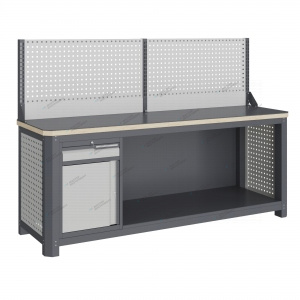 Рама верстака выполнена их холоднокатаной стали. Опоры допускают частичную регулировку по высоте для компенсации неровности пола. Все металлические элементы покрыты полиэфирной порошковой краской, обеспечивающей хорошую износостойкость покрытия и невосприимчивость его к моющим средствам и смазочным веществам. Верстак имеет декларацию соответствия ТР ТС 025/2012 «О безопасности мебельной продукции». Верстак имеет сертификат соответствия ГОСТ Р 58863-2020 «Столы производственные. Верстаки из металла. Общие технические условия». Столешница состоит из листа влагостойкой фанеры марки ФСФ толщиной 40 мм, которая покрыта лаком-антисептиком и листом горячекатаной стали толщиной 5 мм. Глубина столешниц 743 мм. Максимальная масса груза, равномерно распределенного по столешнице, составляет 1500 кг. Модуль верстака выполнен сварными. Ящики в модулях устанавливаются на шариковых телескопических направляющих полного выдвижения. В модуле S7 установлена дверь и две полки. Дверь имеет размеры (ВхШхГ), не более: 578 х 367 х 25 мм. Полка модуля имеет размеры (ВхШхГ), не более: 25 х 367 х 510 мм. Максимально допустимая масса груза, равномерно распределенного по поверхности полки 31 кг. Комплект полка-стенка SW1. Размеры полки (ВхШхГ), не более: 35 х 415 х 619 мм. Размеры стенки (ВхШхГ), не более: 652 х 415 х 25 мм. Максимально допустимая масса груза, равномерно распределенного по поверхности полки 31 кг. Модули с ящиками снабжены общим центральным замком с поворотом ригеля 180 градусов и подпружиненной тягой. В комплекте два ключа для каждого замка. Квадратная перфорация на элементах верстака предназначена для установки крючков, держателей и других аксессуаров, имеет размеры: квадрат 12х12мм. шаг 38мм. Экран (перфорированная панель) верстака выполнен с квадратной перфорацией 12х12 мм с шагом 38 мм для установки крючков, держателей и других аксессуаров. Экран крепятся к столешнице с помощью специальных кронштейнов. Максимальная масса груза, равномерно распределенного по поверхности экрана, составляет 71 кг. Характеристики **Габариты и вес товара с упаковкой Общий вес с упаковкой - 0 кг Упаковка Размеры упаковки (Д*Ш*В), мм Вес, кг Упаковка №1 x x 0 ** Теоретический вес