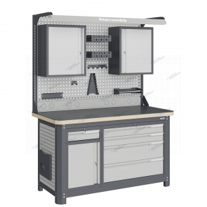 Рама верстака выполнена их холоднокатаной стали. Опоры допускают частичную регулировку по высоте для компенсации неровности пола. Все металлические элементы покрыты полиэфирной порошковой краской, обеспечивающей хорошую износостойкость покрытия и невосприимчивость его к моющим средствам и смазочным веществам. Верстак имеет декларацию соответствия ТР ТС 025/2012 «О безопасности мебельной продукции». Верстак имеет сертификат соответствия ГОСТ Р 58863-2020 «Столы производственные. Верстаки из металла. Общие технические условия». Столешница состоит из листа влагостойкой фанеры марки ФСФ толщиной 40 мм, которая покрыта лаком-антисептиком и листом горячекатаной стали толщиной 5 мм. Глубина столешниц 743 мм. Максимальная масса груза, равномерно распределенного по столешнице, составляет 1500 кг. Модуль верстака выполнен сварными. Ящики в модулях устанавливаются на шариковых телескопических направляющих полного выдвижения. В модуле S8 установлен один малый ящик, дверь и одна полка. Внутренние размеры малого ящика (ВхШхГ), не более: 75 х 340 х 500 мм. Дверь имеет размеры (ВхШхГ), не более: 443 х 367 х 25 мм. Полка модуля имеет размеры (ВхШхГ), не более: 25 х 367 х 510 мм. Максимально допустимая масса груза, равномерно распределенного по поверхности любого выдвижного ящика и полки 31 кг. В модуле L4 установлено два малых ящика и два больших ящика. Внутренние размеры малых ящиков (ВхШхГ), не более: 75 х 755 х 500 мм. Внутренние размеры больших ящиков (ВхШхГ), не более: 172 х 755 х 500 мм. Максимально допустимая масса груза, равномерно распределенного по поверхности любого выдвижного ящика 31 кг. Модули с ящиками снабжены общим центральным замком с поворотом ригеля 180 градусов и подпружиненной тягой. В комплекте два ключа для каждого замка. Квадратная перфорация на элементах верстака предназначена для установки крючков, держателей и других аксессуаров, имеет размеры: квадрат 12х12мм. шаг 38мм. Экран (перфорированная панель) верстака выполнен с квадратной перфорацией 12х12 мм с шагом 38 мм для установки крючков, держателей и других аксессуаров. Экран крепятся к столешнице с помощью специальных кронштейнов. Максимальная масса груза, равномерно распределенного по поверхности экрана, составляет 71 кг. Комплект освещения устанавливается над верстаком. В комплекте идет защитный козырек, кронштейны и лампа с магнитными креплениями, которые позволяют менять ее положение. Блок коммуникаций устанавливается совместно с экранами, в нижней части либо между экранами, предназначен для монтажа электрических приборов. Шкаф навесной оборудован двумя съемными полками, которые при необходимости можно перемещать по вертикали. Размеры шкафа (ВхШхГ), не более: 580 х 490 х 285 мм. Лоток №1 имеет размеры (ВхШхГ), не более: 70 х 260 х 250мм., хранение лёгких вещей. Держатель отвёрток имеет размеры (ВхШхГ), не более: 60 х 260 х 40мм., хранение отвёрток и иных вещей. Держатель ключей имеет размеры (ВхШхГ), не более: 270 х 140 х 40мм., хранение ключей. Держатель рулона имеет размеры (ВхШхГ), не более: 75 х 340 х 130мм., хранение рулона бумажного полотенца, размер рулона ширина – 300мм., диаметр – 180мм. Вешалка №1 имеет размеры (ВхШхГ), не более: 50 х 70 х 30мм., удерживание подвесных вещей, вешалка имеет 2 крючка. Вешалка №2 имеет размеры (ВхШхГ), не более: 50 х 260 х 30мм., удерживание подвесных вещей, вешалка имеет 5 крючков. Карман для документации имее