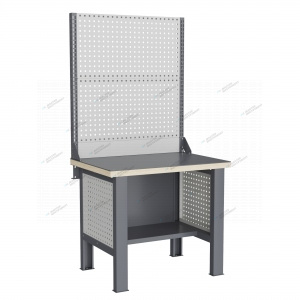 Тумбы и опоры верстаков выполнены из профилированной холоднокатаной стали и имеют сварную конструкцию. Возможна установка любых сочетаний тумб с различным количеством выдвижных ящиков, а также с дверцей и полками. Между тумбами и опорами возможна установка полки-стенки. На каждой ручке ящика и двери закреплен специальный алюминиевый профиль с отделением для установки маркировки. На тумбы с выдвижными ящиками установлена система антиопрокидывания, которая ограничивает выдвижение остальных ящиков тумбы, если один из ящиков выдвинут. Ящики снабжены специальными усиленными шариковыми направляющими. Тумбы снабжены центральной системой запирания. Столешница верстака изготавливается из шлифованной влагостойкой фанеры, которая покрыта лаком-антисептиком. Сверху на фанеру установлена стальная наладка. Верстак может комплектоваться одинарным или двойным перфорированным экраном, электромонтажным блоком для установки розеток и дополнительных устройств, а также комплектом освещения с держателем и лампой. Перфорация экрана подходит под стандартные держатели для инструментов, отверток, крючков, полок. Возможна комплектование верстака навесным элементами (держатели, крючки, полки). Все металлические части верстака покрыты ударопрочной и износостойкой порошковой краской. Возможна окраска верстака в любые цвета по каталогу RAL. Технические характеристики верстаков и рабочих столов: Характеристика Значение Максимальная масса груза, равномерно распределенного по рабочей поверхности столешницы, кг 1000 – 3000 (в зависимости от исполнения верстака или рабочего стола) Максимальная масса груза, распределенного по поверхности ящика 100 кг Максимальная масса груза, распределенного по поверхности полки 161 кг Максимально допустимая масса размещаемого груза на экране (при его наличии) 151 кг Максимально допустимая масса хранимого груза на навесной усиленной полке экрана 41 кг Глубина верстака, не более, мм 745 Фактическая глубина столешницы, мм 743 Толщина столешницы, мм 40 Толщина стальной накладки на столешницу, мм 5 Перфорация экрана, мм 12х12 Шаг перфорации экрана, мм 38 Основной стандартный цвет верстака Высокоглянцевое, гладкое покрытие RAL7024 Основной стандартный цвет экранов, лицевых панелей ящиков и дверей Высокоглянцевое, гладкое покрытие RAL7035 Преимущества серии: наличие в тумбах с ящиками специальной системы антиопрокидывания, которая ограничивает выдвижение остальных ящиков тумбы, если один из ящиков выдвинут, широкий выбор различных тумб позволяет получить более 50 различных вариантов верстаков и рабочих столов под любые задачи, применение в ящиках качественных усиленных шариковых направляющих полного выдвижения байонетного крепления, надежное крепление экранов, поскольку их кронштейны соединены со столешницей через заднюю балку верстаков, наличие блока коммуникаций, который может быть легко разработан под конкретные специальные требования, соответствие верстаков тяжелому классу по ГОСТ Р 58863-2020, уникальная конструкция держателя светильника, которая позволяет легко устанавливать светильник в удобном для работы положении. Комплектующие Столешница GТТ105 (10.743.40.5) - 1шт. Балка GB1 (10.992) – 1шт. Опора G1 – 2шт. Перфопанель GQSP – 2шт. Полка-стенка GSW1 (10.702) – 1шт. Усиленный кронштейн PKS (2.1110) – 2шт. Косынка кронштейна KCS – 2шт. Перфопанел
