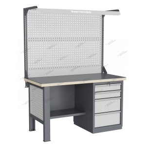 Тумбы и опоры верстаков выполнены из профилированной холоднокатаной стали и имеют сварную конструкцию. Возможна установка любых сочетаний тумб с различным количеством выдвижных ящиков, а также с дверцей и полками. Между тумбами и опорами возможна установка полки-стенки. На каждой ручке ящика и двери закреплен специальный алюминиевый профиль с отделением для установки маркировки. На тумбы с выдвижными ящиками установлена система антиопрокидывания, которая ограничивает выдвижение остальных ящиков тумбы, если один из ящиков выдвинут. Ящики снабжены специальными усиленными шариковыми направляющими. Тумбы снабжены центральной системой запирания. Столешница верстака изготавливается из шлифованной влагостойкой фанеры, которая покрыта лаком-антисептиком. Сверху на фанеру установлена стальная наладка. Верстак может комплектоваться одинарным или двойным перфорированным экраном, электромонтажным блоком для установки розеток и дополнительных устройств, а также комплектом освещения с держателем и лампой. Перфорация экрана подходит под стандартные держатели для инструментов, отверток, крючков, полок. Возможна комплектование верстака навесным элементами (держатели, крючки, полки). Все металлические части верстака покрыты ударопрочной и износостойкой порошковой краской. Возможна окраска верстака в любые цвета по каталогу RAL. Технические характеристики верстаков и рабочих столов: Характеристика Значение Максимальная масса груза, равномерно распределенного по рабочей поверхности столешницы, кг 1000 – 3000 (в зависимости от исполнения верстака или рабочего стола) Максимальная масса груза, распределенного по поверхности ящика 100 кг Максимальная масса груза, распределенного по поверхности полки 161 кг Максимально допустимая масса размещаемого груза на экране (при его наличии) 151 кг Максимально допустимая масса хранимого груза на навесной усиленной полке экрана 41 кг Глубина верстака, не более, мм 745 Фактическая глубина столешницы, мм 743 Толщина столешницы, мм 40 Толщина стальной накладки на столешницу, мм 5 Перфорация экрана, мм 12х12 Шаг перфорации экрана, мм 38 Основной стандартный цвет верстака Высокоглянцевое, гладкое покрытие RAL7024 Основной стандартный цвет экранов, лицевых панелей ящиков и дверей Высокоглянцевое, гладкое покрытие RAL7035 Преимущества серии: наличие в тумбах с ящиками специальной системы антиопрокидывания, которая ограничивает выдвижение остальных ящиков тумбы, если один из ящиков выдвинут, широкий выбор различных тумб позволяет получить более 50 различных вариантов верстаков и рабочих столов под любые задачи, применение в ящиках качественных усиленных шариковых направляющих полного выдвижения байонетного крепления, надежное крепление экранов, поскольку их кронштейны соединены со столешницей через заднюю балку верстаков, наличие блока коммуникаций, который может быть легко разработан под конкретные специальные требования, соответствие верстаков тяжелому классу по ГОСТ Р 58863-2020, уникальная конструкция держателя светильника, которая позволяет легко устанавливать светильник в удобном для работы положении. Комплектующие Столешница GTT155 (15.743.40.5) – 1шт. Балка GB2 (15.1492) – 1шт. Опора G1 – 1шт. Тумба G4 – 1шт. Перфопанель GQSP – 1шт. Полка-стенка GSW3 (15.755) – 1шт. Усиленный кронштейн PKS (2.1110) – 2шт. Косынка кронштейна KCS – 2