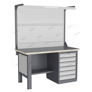 Тумбы и опоры верстаков выполнены из профилированной холоднокатаной стали и имеют сварную конструкцию. Возможна установка любых сочетаний тумб с различным количеством выдвижных ящиков, а также с дверцей и полками. Между тумбами и опорами возможна установка полки-стенки. На каждой ручке ящика и двери закреплен специальный алюминиевый профиль с отделением для установки маркировки. На тумбы с выдвижными ящиками установлена система антиопрокидывания, которая ограничивает выдвижение остальных ящиков тумбы, если один из ящиков выдвинут. Ящики снабжены специальными усиленными шариковыми направляющими. Тумбы снабжены центральной системой запирания. Столешница верстака изготавливается из шлифованной влагостойкой фанеры, которая покрыта лаком-антисептиком. Сверху на фанеру установлена стальная наладка. Верстак может комплектоваться одинарным или двойным перфорированным экраном, электромонтажным блоком для установки розеток и дополнительных устройств, а также комплектом освещения с держателем и лампой. Перфорация экрана подходит под стандартные держатели для инструментов, отверток, крючков, полок. Возможна комплектование верстака навесным элементами (держатели, крючки, полки). Все металлические части верстака покрыты ударопрочной и износостойкой порошковой краской. Возможна окраска верстака в любые цвета по каталогу RAL. Технические характеристики верстаков и рабочих столов: Характеристика Значение Максимальная масса груза, равномерно распределенного по рабочей поверхности столешницы, кг 1000 – 3000 (в зависимости от исполнения верстака или рабочего стола) Максимальная масса груза, распределенного по поверхности ящика 100 кг Максимальная масса груза, распределенного по поверхности полки 161 кг Максимально допустимая масса размещаемого груза на экране (при его наличии) 151 кг Максимально допустимая масса хранимого груза на навесной усиленной полке экрана 41 кг Глубина верстака, не более, мм 745 Фактическая глубина столешницы, мм 743 Толщина столешницы, мм 40 Толщина стальной накладки на столешницу, мм 5 Перфорация экрана, мм 12х12 Шаг перфорации экрана, мм 38 Основной стандартный цвет верстака Высокоглянцевое, гладкое покрытие RAL7024 Основной стандартный цвет экранов, лицевых панелей ящиков и дверей Высокоглянцевое, гладкое покрытие RAL7035 Преимущества серии: наличие в тумбах с ящиками специальной системы антиопрокидывания, которая ограничивает выдвижение остальных ящиков тумбы, если один из ящиков выдвинут, широкий выбор различных тумб позволяет получить более 50 различных вариантов верстаков и рабочих столов под любые задачи, применение в ящиках качественных усиленных шариковых направляющих полного выдвижения байонетного крепления, надежное крепление экранов, поскольку их кронштейны соединены со столешницей через заднюю балку верстаков, наличие блока коммуникаций, который может быть легко разработан под конкретные специальные требования, соответствие верстаков тяжелому классу по ГОСТ Р 58863-2020, уникальная конструкция держателя светильника, которая позволяет легко устанавливать светильник в удобном для работы положении. Комплектующие Столешница GTT155 (15.743.40.5) – 1шт. Балка GB2 (15.1492) – 1шт. Опора G1 – 1шт. Тумба G6 – 1шт. Перфопанель GQSP – 1шт. Полка-стенка GSW3 (15.755) – 1шт. Усиленный кронштейн PKS (2.1110) – 2шт. Косынка кронштейна KCS – 2