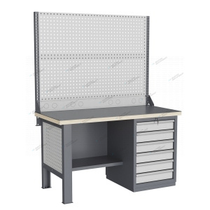 Тумбы и опоры верстаков выполнены из профилированной холоднокатаной стали и имеют сварную конструкцию. Возможна установка любых сочетаний тумб с различным количеством выдвижных ящиков, а также с дверцей и полками. Между тумбами и опорами возможна установка полки-стенки. На каждой ручке ящика и двери закреплен специальный алюминиевый профиль с отделением для установки маркировки. На тумбы с выдвижными ящиками установлена система антиопрокидывания, которая ограничивает выдвижение остальных ящиков тумбы, если один из ящиков выдвинут. Ящики снабжены специальными усиленными шариковыми направляющими. Тумбы снабжены центральной системой запирания. Столешница верстака изготавливается из шлифованной влагостойкой фанеры, которая покрыта лаком-антисептиком. Сверху на фанеру установлена стальная наладка. Верстак может комплектоваться одинарным или двойным перфорированным экраном, электромонтажным блоком для установки розеток и дополнительных устройств, а также комплектом освещения с держателем и лампой. Перфорация экрана подходит под стандартные держатели для инструментов, отверток, крючков, полок. Возможна комплектование верстака навесным элементами (держатели, крючки, полки). Все металлические части верстака покрыты ударопрочной и износостойкой порошковой краской. Возможна окраска верстака в любые цвета по каталогу RAL. Технические характеристики верстаков и рабочих столов: Характеристика Значение Максимальная масса груза, равномерно распределенного по рабочей поверхности столешницы, кг 1000 – 3000 (в зависимости от исполнения верстака или рабочего стола) Максимальная масса груза, распределенного по поверхности ящика 100 кг Максимальная масса груза, распределенного по поверхности полки 161 кг Максимально допустимая масса размещаемого груза на экране (при его наличии) 151 кг Максимально допустимая масса хранимого груза на навесной усиленной полке экрана 41 кг Глубина верстака, не более, мм 745 Фактическая глубина столешницы, мм 743 Толщина столешницы, мм 40 Толщина стальной накладки на столешницу, мм 5 Перфорация экрана, мм 12х12 Шаг перфорации экрана, мм 38 Основной стандартный цвет верстака Высокоглянцевое, гладкое покрытие RAL7024 Основной стандартный цвет экранов, лицевых панелей ящиков и дверей Высокоглянцевое, гладкое покрытие RAL7035 Преимущества серии: наличие в тумбах с ящиками специальной системы антиопрокидывания, которая ограничивает выдвижение остальных ящиков тумбы, если один из ящиков выдвинут, широкий выбор различных тумб позволяет получить более 50 различных вариантов верстаков и рабочих столов под любые задачи, применение в ящиках качественных усиленных шариковых направляющих полного выдвижения байонетного крепления, надежное крепление экранов, поскольку их кронштейны соединены со столешницей через заднюю балку верстаков, наличие блока коммуникаций, который может быть легко разработан под конкретные специальные требования, соответствие верстаков тяжелому классу по ГОСТ Р 58863-2020, уникальная конструкция держателя светильника, которая позволяет легко устанавливать светильник в удобном для работы положении. Комплектующие Столешница GTT155 (15.743.40.5) – 1шт. Балка GB2 (15.1492) – 1шт. Опора G1 – 1шт. Тумба G6 – 1шт. Перфопанель GQSP – 1шт. Полка-стенка GSW3 (15.755) – 1шт. Усиленный кронштейн PKS (2.1110) – 2шт. Косынка кронштейна KCS – 2