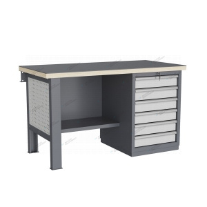 Тумбы и опоры верстаков выполнены из профилированной холоднокатаной стали и имеют сварную конструкцию. Возможна установка любых сочетаний тумб с различным количеством выдвижных ящиков, а также с дверцей и полками. Между тумбами и опорами возможна установка полки-стенки. На каждой ручке ящика и двери закреплен специальный алюминиевый профиль с отделением для установки маркировки. На тумбы с выдвижными ящиками установлена система антиопрокидывания, которая ограничивает выдвижение остальных ящиков тумбы, если один из ящиков выдвинут. Ящики снабжены специальными усиленными шариковыми направляющими. Тумбы снабжены центральной системой запирания. Столешница верстака изготавливается из шлифованной влагостойкой фанеры, которая покрыта лаком-антисептиком. Сверху на фанеру установлена стальная наладка. Верстак может комплектоваться одинарным или двойным перфорированным экраном, электромонтажным блоком для установки розеток и дополнительных устройств, а также комплектом освещения с держателем и лампой. Перфорация экрана подходит под стандартные держатели для инструментов, отверток, крючков, полок. Возможна комплектование верстака навесным элементами (держатели, крючки, полки). Все металлические части верстака покрыты ударопрочной и износостойкой порошковой краской. Возможна окраска верстака в любые цвета по каталогу RAL. Технические характеристики верстаков и рабочих столов: Характеристика Значение Максимальная масса груза, равномерно распределенного по рабочей поверхности столешницы, кг 1000 – 3000 (в зависимости от исполнения верстака или рабочего стола) Максимальная масса груза, распределенного по поверхности ящика 100 кг Максимальная масса груза, распределенного по поверхности полки 161 кг Максимально допустимая масса размещаемого груза на экране (при его наличии) 151 кг Максимально допустимая масса хранимого груза на навесной усиленной полке экрана 41 кг Глубина верстака, не более, мм 745 Фактическая глубина столешницы, мм 743 Толщина столешницы, мм 40 Толщина стальной накладки на столешницу, мм 5 Перфорация экрана, мм 12х12 Шаг перфорации экрана, мм 38 Основной стандартный цвет верстака Высокоглянцевое, гладкое покрытие RAL7024 Основной стандартный цвет экранов, лицевых панелей ящиков и дверей Высокоглянцевое, гладкое покрытие RAL7035 Преимущества серии: наличие в тумбах с ящиками специальной системы антиопрокидывания, которая ограничивает выдвижение остальных ящиков тумбы, если один из ящиков выдвинут, широкий выбор различных тумб позволяет получить более 50 различных вариантов верстаков и рабочих столов под любые задачи, применение в ящиках качественных усиленных шариковых направляющих полного выдвижения байонетного крепления, надежное крепление экранов, поскольку их кронштейны соединены со столешницей через заднюю балку верстаков, наличие блока коммуникаций, который может быть легко разработан под конкретные специальные требования, соответствие верстаков тяжелому классу по ГОСТ Р 58863-2020, уникальная конструкция держателя светильника, которая позволяет легко устанавливать светильник в удобном для работы положении. Комплектующие Столешница GTT155 (15.743.40.5) – 1шт. Балка GB2 (15.1492) – 1шт. Опора G1 – 1шт. Тумба G6 – 1шт. Перфопанель GQSP – 1шт. Полка-стенка GSW3 (15.755) – 1шт. Характеристики **Габариты и вес товара с упаковкой Общий в