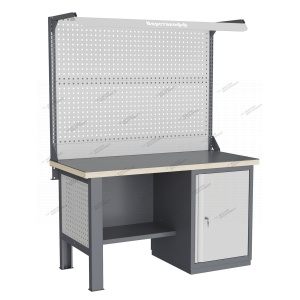 Тумбы и опоры верстаков выполнены из профилированной холоднокатаной стали и имеют сварную конструкцию. Возможна установка любых сочетаний тумб с различным количеством выдвижных ящиков, а также с дверцей и полками. Между тумбами и опорами возможна установка полки-стенки. На каждой ручке ящика и двери закреплен специальный алюминиевый профиль с отделением для установки маркировки. На тумбы с выдвижными ящиками установлена система антиопрокидывания, которая ограничивает выдвижение остальных ящиков тумбы, если один из ящиков выдвинут. Ящики снабжены специальными усиленными шариковыми направляющими. Тумбы снабжены центральной системой запирания. Столешница верстака изготавливается из шлифованной влагостойкой фанеры, которая покрыта лаком-антисептиком. Сверху на фанеру установлена стальная наладка. Верстак может комплектоваться одинарным или двойным перфорированным экраном, электромонтажным блоком для установки розеток и дополнительных устройств, а также комплектом освещения с держателем и лампой. Перфорация экрана подходит под стандартные держатели для инструментов, отверток, крючков, полок. Возможна комплектование верстака навесным элементами (держатели, крючки, полки). Все металлические части верстака покрыты ударопрочной и износостойкой порошковой краской. Возможна окраска верстака в любые цвета по каталогу RAL. Технические характеристики верстаков и рабочих столов: Характеристика Значение Максимальная масса груза, равномерно распределенного по рабочей поверхности столешницы, кг 1000 – 3000 (в зависимости от исполнения верстака или рабочего стола) Максимальная масса груза, распределенного по поверхности ящика 100 кг Максимальная масса груза, распределенного по поверхности полки 161 кг Максимально допустимая масса размещаемого груза на экране (при его наличии) 151 кг Максимально допустимая масса хранимого груза на навесной усиленной полке экрана 41 кг Глубина верстака, не более, мм 745 Фактическая глубина столешницы, мм 743 Толщина столешницы, мм 40 Толщина стальной накладки на столешницу, мм 5 Перфорация экрана, мм 12х12 Шаг перфорации экрана, мм 38 Основной стандартный цвет верстака Высокоглянцевое, гладкое покрытие RAL7024 Основной стандартный цвет экранов, лицевых панелей ящиков и дверей Высокоглянцевое, гладкое покрытие RAL7035 Преимущества серии: наличие в тумбах с ящиками специальной системы антиопрокидывания, которая ограничивает выдвижение остальных ящиков тумбы, если один из ящиков выдвинут, широкий выбор различных тумб позволяет получить более 50 различных вариантов верстаков и рабочих столов под любые задачи, применение в ящиках качественных усиленных шариковых направляющих полного выдвижения байонетного крепления, надежное крепление экранов, поскольку их кронштейны соединены со столешницей через заднюю балку верстаков, наличие блока коммуникаций, который может быть легко разработан под конкретные специальные требования, соответствие верстаков тяжелому классу по ГОСТ Р 58863-2020, уникальная конструкция держателя светильника, которая позволяет легко устанавливать светильник в удобном для работы положении. Комплектующие Столешница GTT155 (15.743.40.5) – 1шт. Балка GB2 (15.1492) – 1шт. Опора G1 – 1шт. Тумба G7 – 1шт. Перфопанель GQSP – 1шт. Полка-стенка GSW3 (15.755) – 1шт. Усиленный кронштейн PKS (2.1110) – 2шт. Косынка кронштейна KCS – 2