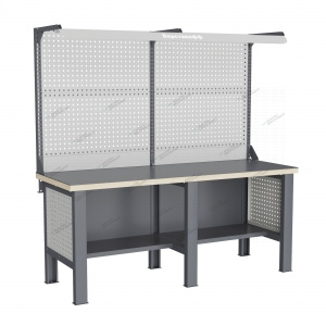 Тумбы и опоры верстаков выполнены из профилированной холоднокатаной стали и имеют сварную конструкцию. Возможна установка любых сочетаний тумб с различным количеством выдвижных ящиков, а также с дверцей и полками. Между тумбами и опорами возможна установка полки-стенки. На каждой ручке ящика и двери закреплен специальный алюминиевый профиль с отделением для установки маркировки. На тумбы с выдвижными ящиками установлена система антиопрокидывания, которая ограничивает выдвижение остальных ящиков тумбы, если один из ящиков выдвинут. Ящики снабжены специальными усиленными шариковыми направляющими. Тумбы снабжены центральной системой запирания. Столешница верстака изготавливается из шлифованной влагостойкой фанеры, которая покрыта лаком-антисептиком. Сверху на фанеру установлена стальная наладка. Верстак может комплектоваться одинарным или двойным перфорированным экраном, электромонтажным блоком для установки розеток и дополнительных устройств, а также комплектом освещения с держателем и лампой. Перфорация экрана подходит под стандартные держатели для инструментов, отверток, крючков, полок. Возможна комплектование верстака навесным элементами (держатели, крючки, полки). Все металлические части верстака покрыты ударопрочной и износостойкой порошковой краской. Возможна окраска верстака в любые цвета по каталогу RAL. Технические характеристики верстаков и рабочих столов: Характеристика Значение Максимальная масса груза, равномерно распределенного по рабочей поверхности столешницы, кг 1000 – 3000 (в зависимости от исполнения верстака или рабочего стола) Максимальная масса груза, распределенного по поверхности ящика 100 кг Максимальная масса груза, распределенного по поверхности полки 161 кг Максимально допустимая масса размещаемого груза на экране (при его наличии) 151 кг Максимально допустимая масса хранимого груза на навесной усиленной полке экрана 41 кг Глубина верстака, не более, мм 745 Фактическая глубина столешницы, мм 743 Толщина столешницы, мм 40 Толщина стальной накладки на столешницу, мм 5 Перфорация экрана, мм 12х12 Шаг перфорации экрана, мм 38 Основной стандартный цвет верстака Высокоглянцевое, гладкое покрытие RAL7024 Основной стандартный цвет экранов, лицевых панелей ящиков и дверей Высокоглянцевое, гладкое покрытие RAL7035 Преимущества серии: наличие в тумбах с ящиками специальной системы антиопрокидывания, которая ограничивает выдвижение остальных ящиков тумбы, если один из ящиков выдвинут, широкий выбор различных тумб позволяет получить более 50 различных вариантов верстаков и рабочих столов под любые задачи, применение в ящиках качественных усиленных шариковых направляющих полного выдвижения байонетного крепления, надежное крепление экранов, поскольку их кронштейны соединены со столешницей через заднюю балку верстаков, наличие блока коммуникаций, который может быть легко разработан под конкретные специальные требования, соответствие верстаков тяжелому классу по ГОСТ Р 58863-2020, уникальная конструкция держателя светильника, которая позволяет легко устанавливать светильник в удобном для работы положении. Комплектующие Столешница GTT205 (20.743.40.5) – 1шт. Балка GB3 (20.1992) – 1шт. Опора G1 – 3шт. Перфопанель GQSP – 2шт. Полка-стенка GSW4 (20.807) – 2шт. Усиленный кронштейн PKS (2.1110) – 3шт. Косынка кронштейна KCS – 2шт. Перфопане