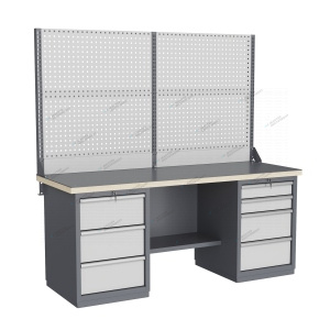 Тумбы и опоры верстаков выполнены из профилированной холоднокатаной стали и имеют сварную конструкцию. Возможна установка любых сочетаний тумб с различным количеством выдвижных ящиков, а также с дверцей и полками. Между тумбами и опорами возможна установка полки-стенки. На каждой ручке ящика и двери закреплен специальный алюминиевый профиль с отделением для установки маркировки. На тумбы с выдвижными ящиками установлена система антиопрокидывания, которая ограничивает выдвижение остальных ящиков тумбы, если один из ящиков выдвинут. Ящики снабжены специальными усиленными шариковыми направляющими. Тумбы снабжены центральной системой запирания. Столешница верстака изготавливается из шлифованной влагостойкой фанеры, которая покрыта лаком-антисептиком. Сверху на фанеру установлена стальная наладка. Верстак может комплектоваться одинарным или двойным перфорированным экраном, электромонтажным блоком для установки розеток и дополнительных устройств, а также комплектом освещения с держателем и лампой. Перфорация экрана подходит под стандартные держатели для инструментов, отверток, крючков, полок. Возможна комплектование верстака навесным элементами (держатели, крючки, полки). Все металлические части верстака покрыты ударопрочной и износостойкой порошковой краской. Возможна окраска верстака в любые цвета по каталогу RAL. Технические характеристики верстаков и рабочих столов: Характеристика Значение Максимальная масса груза, равномерно распределенного по рабочей поверхности столешницы, кг 1000 – 3000 (в зависимости от исполнения верстака или рабочего стола) Максимальная масса груза, распределенного по поверхности ящика 100 кг Максимальная масса груза, распределенного по поверхности полки 161 кг Максимально допустимая масса размещаемого груза на экране (при его наличии) 151 кг Максимально допустимая масса хранимого груза на навесной усиленной полке экрана 41 кг Глубина верстака, не более, мм 745 Фактическая глубина столешницы, мм 743 Толщина столешницы, мм 40 Толщина стальной накладки на столешницу, мм 5 Перфорация экрана, мм 12х12 Шаг перфорации экрана, мм 38 Основной стандартный цвет верстака Высокоглянцевое, гладкое покрытие RAL7024 Основной стандартный цвет экранов, лицевых панелей ящиков и дверей Высокоглянцевое, гладкое покрытие RAL7035 Преимущества серии: наличие в тумбах с ящиками специальной системы антиопрокидывания, которая ограничивает выдвижение остальных ящиков тумбы, если один из ящиков выдвинут, широкий выбор различных тумб позволяет получить более 50 различных вариантов верстаков и рабочих столов под любые задачи, применение в ящиках качественных усиленных шариковых направляющих полного выдвижения байонетного крепления, надежное крепление экранов, поскольку их кронштейны соединены со столешницей через заднюю балку верстаков, наличие блока коммуникаций, который может быть легко разработан под конкретные специальные требования, соответствие верстаков тяжелому классу по ГОСТ Р 58863-2020, уникальная конструкция держателя светильника, которая позволяет легко устанавливать светильник в удобном для работы положении. Комплектующие Столешница GTT205 (20.743.40.5) – 1шт. Балка GB3 (20.1992) – 1шт. Тумба G3 – 1шт. Тумба G4 – 1шт. Полка-стенка GSW4 (20.807) – 1шт. Усиленный кронштейн PKS (2.1110) – 3шт. Косынка кронштейна KCS – 2шт. Перфопанель QTP (20.93