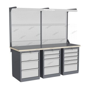 Тумбы и опоры верстаков выполнены из профилированной холоднокатаной стали и имеют сварную конструкцию. Возможна установка любых сочетаний тумб с различным количеством выдвижных ящиков, а также с дверцей и полками. Между тумбами и опорами возможна установка полки-стенки. На каждой ручке ящика и двери закреплен специальный алюминиевый профиль с отделением для установки маркировки. На тумбы с выдвижными ящиками установлена система антиопрокидывания, которая ограничивает выдвижение остальных ящиков тумбы, если один из ящиков выдвинут. Ящики снабжены специальными усиленными шариковыми направляющими. Тумбы снабжены центральной системой запирания. Столешница верстака изготавливается из шлифованной влагостойкой фанеры, которая покрыта лаком-антисептиком. Сверху на фанеру установлена стальная наладка. Верстак может комплектоваться одинарным или двойным перфорированным экраном, электромонтажным блоком для установки розеток и дополнительных устройств, а также комплектом освещения с держателем и лампой. Перфорация экрана подходит под стандартные держатели для инструментов, отверток, крючков, полок. Возможна комплектование верстака навесным элементами (держатели, крючки, полки). Все металлические части верстака покрыты ударопрочной и износостойкой порошковой краской. Возможна окраска верстака в любые цвета по каталогу RAL. Технические характеристики верстаков и рабочих столов: Характеристика Значение Максимальная масса груза, равномерно распределенного по рабочей поверхности столешницы, кг 1000 – 3000 (в зависимости от исполнения верстака или рабочего стола) Максимальная масса груза, распределенного по поверхности ящика 100 кг Максимальная масса груза, распределенного по поверхности полки 161 кг Максимально допустимая масса размещаемого груза на экране (при его наличии) 151 кг Максимально допустимая масса хранимого груза на навесной усиленной полке экрана 41 кг Глубина верстака, не более, мм 745 Фактическая глубина столешницы, мм 743 Толщина столешницы, мм 40 Толщина стальной накладки на столешницу, мм 5 Перфорация экрана, мм 12х12 Шаг перфорации экрана, мм 38 Основной стандартный цвет верстака Высокоглянцевое, гладкое покрытие RAL7024 Основной стандартный цвет экранов, лицевых панелей ящиков и дверей Высокоглянцевое, гладкое покрытие RAL7035 Преимущества серии: наличие в тумбах с ящиками специальной системы антиопрокидывания, которая ограничивает выдвижение остальных ящиков тумбы, если один из ящиков выдвинут, широкий выбор различных тумб позволяет получить более 50 различных вариантов верстаков и рабочих столов под любые задачи, применение в ящиках качественных усиленных шариковых направляющих полного выдвижения байонетного крепления, надежное крепление экранов, поскольку их кронштейны соединены со столешницей через заднюю балку верстаков, наличие блока коммуникаций, который может быть легко разработан под конкретные специальные требования, соответствие верстаков тяжелому классу по ГОСТ Р 58863-2020, уникальная конструкция держателя светильника, которая позволяет легко устанавливать светильник в удобном для работы положении. Комплектующие Столешница GTT205 (20.743.40.5) – 1шт. Балка GB3 (20.1992) – 1шт. Тумба G3 – 1шт. Тумба G4 – 1шт. Тумба G5 – 1шт. Усиленный кронштейн PKS (2.1110) – 3шт. Косынка кронштейна KCS – 2шт. Перфопанель QTP (20.930) – 4шт. Панел