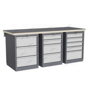 Тумбы и опоры верстаков выполнены из профилированной холоднокатаной стали и имеют сварную конструкцию. Возможна установка любых сочетаний тумб с различным количеством выдвижных ящиков, а также с дверцей и полками. Между тумбами и опорами возможна установка полки-стенки. На каждой ручке ящика и двери закреплен специальный алюминиевый профиль с отделением для установки маркировки. На тумбы с выдвижными ящиками установлена система антиопрокидывания, которая ограничивает выдвижение остальных ящиков тумбы, если один из ящиков выдвинут. Ящики снабжены специальными усиленными шариковыми направляющими. Тумбы снабжены центральной системой запирания. Столешница верстака изготавливается из шлифованной влагостойкой фанеры, которая покрыта лаком-антисептиком. Сверху на фанеру установлена стальная наладка. Верстак может комплектоваться одинарным или двойным перфорированным экраном, электромонтажным блоком для установки розеток и дополнительных устройств, а также комплектом освещения с держателем и лампой. Перфорация экрана подходит под стандартные держатели для инструментов, отверток, крючков, полок. Возможна комплектование верстака навесным элементами (держатели, крючки, полки). Все металлические части верстака покрыты ударопрочной и износостойкой порошковой краской. Возможна окраска верстака в любые цвета по каталогу RAL. Технические характеристики верстаков и рабочих столов: Характеристика Значение Максимальная масса груза, равномерно распределенного по рабочей поверхности столешницы, кг 1000 – 3000 (в зависимости от исполнения верстака или рабочего стола) Максимальная масса груза, распределенного по поверхности ящика 100 кг Максимальная масса груза, распределенного по поверхности полки 161 кг Максимально допустимая масса размещаемого груза на экране (при его наличии) 151 кг Максимально допустимая масса хранимого груза на навесной усиленной полке экрана 41 кг Глубина верстака, не более, мм 745 Фактическая глубина столешницы, мм 743 Толщина столешницы, мм 40 Толщина стальной накладки на столешницу, мм 5 Перфорация экрана, мм 12х12 Шаг перфорации экрана, мм 38 Основной стандартный цвет верстака Высокоглянцевое, гладкое покрытие RAL7024 Основной стандартный цвет экранов, лицевых панелей ящиков и дверей Высокоглянцевое, гладкое покрытие RAL7035 Преимущества серии: наличие в тумбах с ящиками специальной системы антиопрокидывания, которая ограничивает выдвижение остальных ящиков тумбы, если один из ящиков выдвинут, широкий выбор различных тумб позволяет получить более 50 различных вариантов верстаков и рабочих столов под любые задачи, применение в ящиках качественных усиленных шариковых направляющих полного выдвижения байонетного крепления, надежное крепление экранов, поскольку их кронштейны соединены со столешницей через заднюю балку верстаков, наличие блока коммуникаций, который может быть легко разработан под конкретные специальные требования, соответствие верстаков тяжелому классу по ГОСТ Р 58863-2020, уникальная конструкция держателя светильника, которая позволяет легко устанавливать светильник в удобном для работы положении. Комплектующие Столешница GTT205 (20.743.40.5) – 1шт. Балка GB3 (20.1992) – 1шт. Тумба G3 – 1шт. Тумба G4 – 1шт. Тумба G5 – 1шт. Характеристики **Габариты и вес товара с упаковкой Общий вес с упаковкой - 0 кг Упаковка Разме