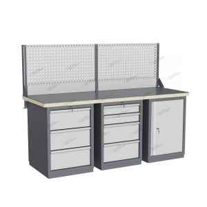 Тумбы и опоры верстаков выполнены из профилированной холоднокатаной стали и имеют сварную конструкцию. Возможна установка любых сочетаний тумб с различным количеством выдвижных ящиков, а также с дверцей и полками. Между тумбами и опорами возможна установка полки-стенки. На каждой ручке ящика и двери закреплен специальный алюминиевый профиль с отделением для установки маркировки. На тумбы с выдвижными ящиками установлена система антиопрокидывания, которая ограничивает выдвижение остальных ящиков тумбы, если один из ящиков выдвинут. Ящики снабжены специальными усиленными шариковыми направляющими. Тумбы снабжены центральной системой запирания. Столешница верстака изготавливается из шлифованной влагостойкой фанеры, которая покрыта лаком-антисептиком. Сверху на фанеру установлена стальная наладка. Верстак может комплектоваться одинарным или двойным перфорированным экраном, электромонтажным блоком для установки розеток и дополнительных устройств, а также комплектом освещения с держателем и лампой. Перфорация экрана подходит под стандартные держатели для инструментов, отверток, крючков, полок. Возможна комплектование верстака навесным элементами (держатели, крючки, полки). Все металлические части верстака покрыты ударопрочной и износостойкой порошковой краской. Возможна окраска верстака в любые цвета по каталогу RAL. Технические характеристики верстаков и рабочих столов: Характеристика Значение Максимальная масса груза, равномерно распределенного по рабочей поверхности столешницы, кг 1000 – 3000 (в зависимости от исполнения верстака или рабочего стола) Максимальная масса груза, распределенного по поверхности ящика 100 кг Максимальная масса груза, распределенного по поверхности полки 161 кг Максимально допустимая масса размещаемого груза на экране (при его наличии) 151 кг Максимально допустимая масса хранимого груза на навесной усиленной полке экрана 41 кг Глубина верстака, не более, мм 745 Фактическая глубина столешницы, мм 743 Толщина столешницы, мм 40 Толщина стальной накладки на столешницу, мм 5 Перфорация экрана, мм 12х12 Шаг перфорации экрана, мм 38 Основной стандартный цвет верстака Высокоглянцевое, гладкое покрытие RAL7024 Основной стандартный цвет экранов, лицевых панелей ящиков и дверей Высокоглянцевое, гладкое покрытие RAL7035 Преимущества серии: наличие в тумбах с ящиками специальной системы антиопрокидывания, которая ограничивает выдвижение остальных ящиков тумбы, если один из ящиков выдвинут, широкий выбор различных тумб позволяет получить более 50 различных вариантов верстаков и рабочих столов под любые задачи, применение в ящиках качественных усиленных шариковых направляющих полного выдвижения байонетного крепления, надежное крепление экранов, поскольку их кронштейны соединены со столешницей через заднюю балку верстаков, наличие блока коммуникаций, который может быть легко разработан под конкретные специальные требования, соответствие верстаков тяжелому классу по ГОСТ Р 58863-2020, уникальная конструкция держателя светильника, которая позволяет легко устанавливать светильник в удобном для работы положении. Комплектующие Столешница GTT205 (20.743.40.5) – 1шт. Балка GB3 (20.1992) – 1шт. Тумба G3 – 1шт. Тумба G4 – 1шт. Тумба G7 – 1шт. Усиленный кронштейн PKS (1.615) – 3шт. Косынка кронштейна KCS – 2шт. Перфопанель QTP (20.930) – 2шт. Панел