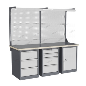Тумбы и опоры верстаков выполнены из профилированной холоднокатаной стали и имеют сварную конструкцию. Возможна установка любых сочетаний тумб с различным количеством выдвижных ящиков, а также с дверцей и полками. Между тумбами и опорами возможна установка полки-стенки. На каждой ручке ящика и двери закреплен специальный алюминиевый профиль с отделением для установки маркировки. На тумбы с выдвижными ящиками установлена система антиопрокидывания, которая ограничивает выдвижение остальных ящиков тумбы, если один из ящиков выдвинут. Ящики снабжены специальными усиленными шариковыми направляющими. Тумбы снабжены центральной системой запирания. Столешница верстака изготавливается из шлифованной влагостойкой фанеры, которая покрыта лаком-антисептиком. Сверху на фанеру установлена стальная наладка. Верстак может комплектоваться одинарным или двойным перфорированным экраном, электромонтажным блоком для установки розеток и дополнительных устройств, а также комплектом освещения с держателем и лампой. Перфорация экрана подходит под стандартные держатели для инструментов, отверток, крючков, полок. Возможна комплектование верстака навесным элементами (держатели, крючки, полки). Все металлические части верстака покрыты ударопрочной и износостойкой порошковой краской. Возможна окраска верстака в любые цвета по каталогу RAL. Технические характеристики верстаков и рабочих столов: Характеристика Значение Максимальная масса груза, равномерно распределенного по рабочей поверхности столешницы, кг 1000 – 3000 (в зависимости от исполнения верстака или рабочего стола) Максимальная масса груза, распределенного по поверхности ящика 100 кг Максимальная масса груза, распределенного по поверхности полки 161 кг Максимально допустимая масса размещаемого груза на экране (при его наличии) 151 кг Максимально допустимая масса хранимого груза на навесной усиленной полке экрана 41 кг Глубина верстака, не более, мм 745 Фактическая глубина столешницы, мм 743 Толщина столешницы, мм 40 Толщина стальной накладки на столешницу, мм 5 Перфорация экрана, мм 12х12 Шаг перфорации экрана, мм 38 Основной стандартный цвет верстака Высокоглянцевое, гладкое покрытие RAL7024 Основной стандартный цвет экранов, лицевых панелей ящиков и дверей Высокоглянцевое, гладкое покрытие RAL7035 Преимущества серии: наличие в тумбах с ящиками специальной системы антиопрокидывания, которая ограничивает выдвижение остальных ящиков тумбы, если один из ящиков выдвинут, широкий выбор различных тумб позволяет получить более 50 различных вариантов верстаков и рабочих столов под любые задачи, применение в ящиках качественных усиленных шариковых направляющих полного выдвижения байонетного крепления, надежное крепление экранов, поскольку их кронштейны соединены со столешницей через заднюю балку верстаков, наличие блока коммуникаций, который может быть легко разработан под конкретные специальные требования, соответствие верстаков тяжелому классу по ГОСТ Р 58863-2020, уникальная конструкция держателя светильника, которая позволяет легко устанавливать светильник в удобном для работы положении. Комплектующие Столешница GTT205 (20.743.40.5) – 1шт. Балка GB3 (20.1992) – 1шт. Тумба G3 – 1шт. Тумба G4 – 1шт. Тумба G7 – 1шт. Усиленный кронштейн PKS (2.1110) – 3шт. Косынка кронштейна KCS – 2шт. Перфопанель QTP (20.930) – 4шт. Панел