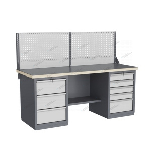 Верстаки и рабочие столы серии GRAND: предназначены для выполнения тяжелых сборочных, слесарных и других видов работ на производстве, для установки в закрытых помещениях, выпускаются по ГОСТ Р 58863-2020 и относятся к верстакам тяжелого класса представляют собой сборно-разборную модульную конструкцию и состоят из тумб или опор, связанных задней балкой, к которым крепится столешница рабочие столы выполняются в бестумбовом исполнении верстаки могут выполняться в однотумбовом, двухтумбовом и трехтумбовом исполнениях Тумбы и опоры верстаков выполнены из профилированной холоднокатаной стали и имеют сварную конструкцию. Возможна установка любых сочетаний тумб с различным количеством выдвижных ящиков, а также с дверцей и полками. Между тумбами и опорами возможна установка полки-стенки. На каждой ручке ящика и двери закреплен специальный алюминиевый профиль с отделением для установки маркировки. На тумбы с выдвижными ящиками установлена система антиопрокидывания, которая ограничивает выдвижение остальных ящиков тумбы, если один из ящиков выдвинут. Ящики снабжены специальными усиленными шариковыми направляющими. Тумбы снабжены центральной системой запирания. Столешница верстака изготавливается из шлифованной влагостойкой фанеры, которая покрыта лаком-антисептиком. Сверху на фанеру установлена стальная наладка. Верстак может комплектоваться одинарным или двойным перфорированным экраном, электромонтажным блоком для установки розеток и дополнительных устройств, а также комплектом освещения с держателем и лампой. Перфорация экрана подходит под стандартные держатели для инструментов, отверток, крючков, полок. Возможна комплектование верстака навесным элементами (держатели, крючки, полки). Все металлические части верстака покрыты ударопрочной и износостойкой порошковой краской. Возможна окраска верстака в любые цвета по каталогу RAL. Технические характеристики верстаков и рабочих столов: Характеристика Значение Максимальная масса груза, равномерно распределенного по рабочей поверхности столешницы, кг 1000 – 3000 (в зависимости от исполнения верстака или рабочего стола) Максимальная масса груза, распределенного по поверхности ящика 100 кг Максимальная масса груза, распределенного по поверхности полки 161 кг Максимально допустимая масса размещаемого груза на экране (при его наличии) 151 кг Максимально допустимая масса хранимого груза на навесной усиленной полке экрана 41 кг Глубина верстака, не более, мм 745 Фактическая глубина столешницы, мм 743 Толщина столешницы, мм 40 Толщина стальной накладки на столешницу, мм 5 Перфорация экрана, мм 12х12 Шаг перфорации экрана, мм 38 Основной стандартный цвет верстака Высокоглянцевое, гладкое покрытие RAL7024 Основной стандартный цвет экранов, лицевых панелей ящиков и дверей Высокоглянцевое, гладкое покрытие RAL7035 Преимущества серии: наличие в тумбах с ящиками специальной системы антиопрокидывания, которая ограничивает выдвижение остальных ящиков тумбы, если один из ящиков выдвинут, широкий выбор различных тумб позволяет получить более 50 различных вариантов верстаков и рабочих столов под любые задачи, применение в ящиках качественных усиленных шариковых направляющих полного выдвижения байонетного крепления, надежное крепление экранов, поскольку их кронштейны соединены со столешницей 