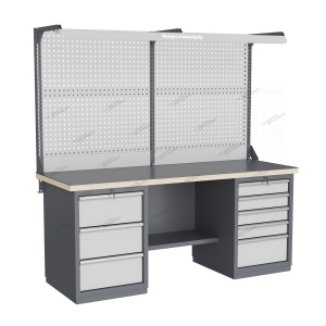 Тумбы и опоры верстаков выполнены из профилированной холоднокатаной стали и имеют сварную конструкцию. Возможна установка любых сочетаний тумб с различным количеством выдвижных ящиков, а также с дверцей и полками. Между тумбами и опорами возможна установка полки-стенки. На каждой ручке ящика и двери закреплен специальный алюминиевый профиль с отделением для установки маркировки. На тумбы с выдвижными ящиками установлена система антиопрокидывания, которая ограничивает выдвижение остальных ящиков тумбы, если один из ящиков выдвинут. Ящики снабжены специальными усиленными шариковыми направляющими. Тумбы снабжены центральной системой запирания. Столешница верстака изготавливается из шлифованной влагостойкой фанеры, которая покрыта лаком-антисептиком. Сверху на фанеру установлена стальная наладка. Верстак может комплектоваться одинарным или двойным перфорированным экраном, электромонтажным блоком для установки розеток и дополнительных устройств, а также комплектом освещения с держателем и лампой. Перфорация экрана подходит под стандартные держатели для инструментов, отверток, крючков, полок. Возможна комплектование верстака навесным элементами (держатели, крючки, полки). Все металлические части верстака покрыты ударопрочной и износостойкой порошковой краской. Возможна окраска верстака в любые цвета по каталогу RAL. Технические характеристики верстаков и рабочих столов: Характеристика Значение Максимальная масса груза, равномерно распределенного по рабочей поверхности столешницы, кг 1000 – 3000 (в зависимости от исполнения верстака или рабочего стола) Максимальная масса груза, распределенного по поверхности ящика 100 кг Максимальная масса груза, распределенного по поверхности полки 161 кг Максимально допустимая масса размещаемого груза на экране (при его наличии) 151 кг Максимально допустимая масса хранимого груза на навесной усиленной полке экрана 41 кг Глубина верстака, не более, мм 745 Фактическая глубина столешницы, мм 743 Толщина столешницы, мм 40 Толщина стальной накладки на столешницу, мм 5 Перфорация экрана, мм 12х12 Шаг перфорации экрана, мм 38 Основной стандартный цвет верстака Высокоглянцевое, гладкое покрытие RAL7024 Основной стандартный цвет экранов, лицевых панелей ящиков и дверей Высокоглянцевое, гладкое покрытие RAL7035 Преимущества серии: наличие в тумбах с ящиками специальной системы антиопрокидывания, которая ограничивает выдвижение остальных ящиков тумбы, если один из ящиков выдвинут, широкий выбор различных тумб позволяет получить более 50 различных вариантов верстаков и рабочих столов под любые задачи, применение в ящиках качественных усиленных шариковых направляющих полного выдвижения байонетного крепления, надежное крепление экранов, поскольку их кронштейны соединены со столешницей через заднюю балку верстаков, наличие блока коммуникаций, который может быть легко разработан под конкретные специальные требования, соответствие верстаков тяжелому классу по ГОСТ Р 58863-2020, уникальная конструкция держателя светильника, которая позволяет легко устанавливать светильник в удобном для работы положении. Комплектующие Столешница GTT205 (20.743.40.5) – 1шт. Балка GB3 (20.1992) – 1шт. Тумба G3 – 1шт. Тумба G5 – 1шт. Полка-стенка GSW4 (20.807) – 1шт. Усиленный кронштейн PKS (2.1110) – 3шт. Косынка кронштейна KCS – 2шт. Перфопанель QTP (20.93