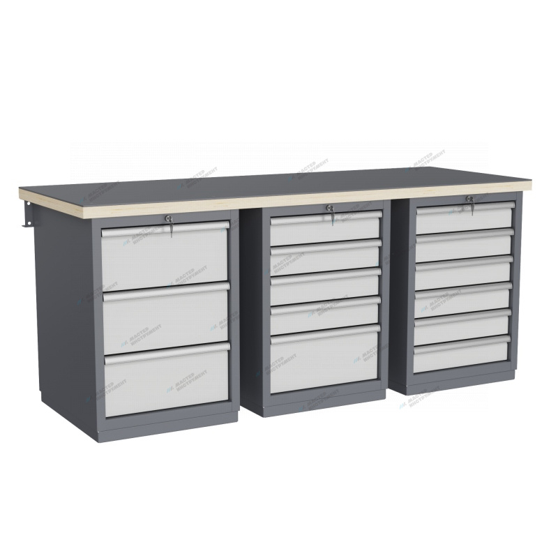 Тумбы и опоры верстаков выполнены из профилированной холоднокатаной стали и имеют сварную конструкцию. Возможна установка любых сочетаний тумб с различным количеством выдвижных ящиков, а также с дверцей и полками. Между тумбами и опорами возможна установка полки-стенки. На каждой ручке ящика и двери закреплен специальный алюминиевый профиль с отделением для установки маркировки. На тумбы с выдвижными ящиками установлена система антиопрокидывания, которая ограничивает выдвижение остальных ящиков тумбы, если один из ящиков выдвинут. Ящики снабжены специальными усиленными шариковыми направляющими. Тумбы снабжены центральной системой запирания. Столешница верстака изготавливается из шлифованной влагостойкой фанеры, которая покрыта лаком-антисептиком. Сверху на фанеру установлена стальная наладка. Верстак может комплектоваться одинарным или двойным перфорированным экраном, электромонтажным блоком для установки розеток и дополнительных устройств, а также комплектом освещения с держателем и лампой. Перфорация экрана подходит под стандартные держатели для инструментов, отверток, крючков, полок. Возможна комплектование верстака навесным элементами (держатели, крючки, полки). Все металлические части верстака покрыты ударопрочной и износостойкой порошковой краской. Возможна окраска верстака в любые цвета по каталогу RAL. Технические характеристики верстаков и рабочих столов: Характеристика Значение Максимальная масса груза, равномерно распределенного по рабочей поверхности столешницы, кг 1000 – 3000 (в зависимости от исполнения верстака или рабочего стола) Максимальная масса груза, распределенного по поверхности ящика 100 кг Максимальная масса груза, распределенного по поверхности полки 161 кг Максимально допустимая масса размещаемого груза на экране (при его наличии) 151 кг Максимально допустимая масса хранимого груза на навесной усиленной полке экрана 41 кг Глубина верстака, не более, мм 745 Фактическая глубина столешницы, мм 743 Толщина столешницы, мм 40 Толщина стальной накладки на столешницу, мм 5 Перфорация экрана, мм 12х12 Шаг перфорации экрана, мм 38 Основной стандартный цвет верстака Высокоглянцевое, гладкое покрытие RAL7024 Основной стандартный цвет экранов, лицевых панелей ящиков и дверей Высокоглянцевое, гладкое покрытие RAL7035 Преимущества серии: наличие в тумбах с ящиками специальной системы антиопрокидывания, которая ограничивает выдвижение остальных ящиков тумбы, если один из ящиков выдвинут, широкий выбор различных тумб позволяет получить более 50 различных вариантов верстаков и рабочих столов под любые задачи, применение в ящиках качественных усиленных шариковых направляющих полного выдвижения байонетного крепления, надежное крепление экранов, поскольку их кронштейны соединены со столешницей через заднюю балку верстаков, наличие блока коммуникаций, который может быть легко разработан под конкретные специальные требования, соответствие верстаков тяжелому классу по ГОСТ Р 58863-2020, уникальная конструкция держателя светильника, которая позволяет легко устанавливать светильник в удобном для работы положении. Комплектующие Столешница GTT205 (20.743.40.5) – 1шт. Балка GB3 (20.1992) – 1шт. Тумба G3 – 1шт. Тумба G5 – 1шт. Тумба G6 – 1шт. *Внешний вид продукции может отличаться от изображения на картинке. Характеристики **Габарит