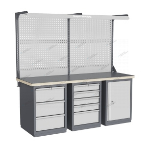 Тумбы и опоры верстаков выполнены из профилированной холоднокатаной стали и имеют сварную конструкцию. Возможна установка любых сочетаний тумб с различным количеством выдвижных ящиков, а также с дверцей и полками. Между тумбами и опорами возможна установка полки-стенки. На каждой ручке ящика и двери закреплен специальный алюминиевый профиль с отделением для установки маркировки. На тумбы с выдвижными ящиками установлена система антиопрокидывания, которая ограничивает выдвижение остальных ящиков тумбы, если один из ящиков выдвинут. Ящики снабжены специальными усиленными шариковыми направляющими. Тумбы снабжены центральной системой запирания. Столешница верстака изготавливается из шлифованной влагостойкой фанеры, которая покрыта лаком-антисептиком. Сверху на фанеру установлена стальная наладка. Верстак может комплектоваться одинарным или двойным перфорированным экраном, электромонтажным блоком для установки розеток и дополнительных устройств, а также комплектом освещения с держателем и лампой. Перфорация экрана подходит под стандартные держатели для инструментов, отверток, крючков, полок. Возможна комплектование верстака навесным элементами (держатели, крючки, полки). Все металлические части верстака покрыты ударопрочной и износостойкой порошковой краской. Возможна окраска верстака в любые цвета по каталогу RAL. Технические характеристики верстаков и рабочих столов: Характеристика Значение Максимальная масса груза, равномерно распределенного по рабочей поверхности столешницы, кг 1000 – 3000 (в зависимости от исполнения верстака или рабочего стола) Максимальная масса груза, распределенного по поверхности ящика 100 кг Максимальная масса груза, распределенного по поверхности полки 161 кг Максимально допустимая масса размещаемого груза на экране (при его наличии) 151 кг Максимально допустимая масса хранимого груза на навесной усиленной полке экрана 41 кг Глубина верстака, не более, мм 745 Фактическая глубина столешницы, мм 743 Толщина столешницы, мм 40 Толщина стальной накладки на столешницу, мм 5 Перфорация экрана, мм 12х12 Шаг перфорации экрана, мм 38 Основной стандартный цвет верстака Высокоглянцевое, гладкое покрытие RAL7024 Основной стандартный цвет экранов, лицевых панелей ящиков и дверей Высокоглянцевое, гладкое покрытие RAL7035 Преимущества серии: наличие в тумбах с ящиками специальной системы антиопрокидывания, которая ограничивает выдвижение остальных ящиков тумбы, если один из ящиков выдвинут, широкий выбор различных тумб позволяет получить более 50 различных вариантов верстаков и рабочих столов под любые задачи, применение в ящиках качественных усиленных шариковых направляющих полного выдвижения байонетного крепления, надежное крепление экранов, поскольку их кронштейны соединены со столешницей через заднюю балку верстаков, наличие блока коммуникаций, который может быть легко разработан под конкретные специальные требования, соответствие верстаков тяжелому классу по ГОСТ Р 58863-2020, уникальная конструкция держателя светильника, которая позволяет легко устанавливать светильник в удобном для работы положении. Комплектующие Столешница GTT205 (20.743.40.5) – 1шт. Балка GB3 (20.1992) – 1шт. Тумба G3 – 1шт. Тумба G5 – 1шт. Тумба G7 – 1шт. Усиленный кронштейн PKS (2.1110) – 3шт. Косынка кронштейна KCS – 2шт. Перфопанель QTP (20.930) – 4шт. Панел