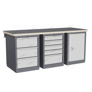 Тумбы и опоры верстаков выполнены из профилированной холоднокатаной стали и имеют сварную конструкцию. Возможна установка любых сочетаний тумб с различным количеством выдвижных ящиков, а также с дверцей и полками. Между тумбами и опорами возможна установка полки-стенки. На каждой ручке ящика и двери закреплен специальный алюминиевый профиль с отделением для установки маркировки. На тумбы с выдвижными ящиками установлена система антиопрокидывания, которая ограничивает выдвижение остальных ящиков тумбы, если один из ящиков выдвинут. Ящики снабжены специальными усиленными шариковыми направляющими. Тумбы снабжены центральной системой запирания. Столешница верстака изготавливается из шлифованной влагостойкой фанеры, которая покрыта лаком-антисептиком. Сверху на фанеру установлена стальная наладка. Верстак может комплектоваться одинарным или двойным перфорированным экраном, электромонтажным блоком для установки розеток и дополнительных устройств, а также комплектом освещения с держателем и лампой. Перфорация экрана подходит под стандартные держатели для инструментов, отверток, крючков, полок. Возможна комплектование верстака навесным элементами (держатели, крючки, полки). Все металлические части верстака покрыты ударопрочной и износостойкой порошковой краской. Возможна окраска верстака в любые цвета по каталогу RAL. Технические характеристики верстаков и рабочих столов: Характеристика Значение Максимальная масса груза, равномерно распределенного по рабочей поверхности столешницы, кг 1000 – 3000 (в зависимости от исполнения верстака или рабочего стола) Максимальная масса груза, распределенного по поверхности ящика 100 кг Максимальная масса груза, распределенного по поверхности полки 161 кг Максимально допустимая масса размещаемого груза на экране (при его наличии) 151 кг Максимально допустимая масса хранимого груза на навесной усиленной полке экрана 41 кг Глубина верстака, не более, мм 745 Фактическая глубина столешницы, мм 743 Толщина столешницы, мм 40 Толщина стальной накладки на столешницу, мм 5 Перфорация экрана, мм 12х12 Шаг перфорации экрана, мм 38 Основной стандартный цвет верстака Высокоглянцевое, гладкое покрытие RAL7024 Основной стандартный цвет экранов, лицевых панелей ящиков и дверей Высокоглянцевое, гладкое покрытие RAL7035 Преимущества серии: наличие в тумбах с ящиками специальной системы антиопрокидывания, которая ограничивает выдвижение остальных ящиков тумбы, если один из ящиков выдвинут, широкий выбор различных тумб позволяет получить более 50 различных вариантов верстаков и рабочих столов под любые задачи, применение в ящиках качественных усиленных шариковых направляющих полного выдвижения байонетного крепления, надежное крепление экранов, поскольку их кронштейны соединены со столешницей через заднюю балку верстаков, наличие блока коммуникаций, который может быть легко разработан под конкретные специальные требования, соответствие верстаков тяжелому классу по ГОСТ Р 58863-2020, уникальная конструкция держателя светильника, которая позволяет легко устанавливать светильник в удобном для работы положении. Комплектующие Столешница GTT205 (20.743.40.5) – 1шт. Балка GB3 (20.1992) – 1шт. Тумба G3 – 1шт. Тумба G5 – 1шт. Тумба G7 – 1шт. Характеристики **Габариты и вес товара с упаковкой Общий вес с упаковкой - 0 кг Упаковка Разме