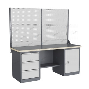 Тумбы и опоры верстаков выполнены из профилированной холоднокатаной стали и имеют сварную конструкцию. Возможна установка любых сочетаний тумб с различным количеством выдвижных ящиков, а также с дверцей и полками. Между тумбами и опорами возможна установка полки-стенки. На каждой ручке ящика и двери закреплен специальный алюминиевый профиль с отделением для установки маркировки. На тумбы с выдвижными ящиками установлена система антиопрокидывания, которая ограничивает выдвижение остальных ящиков тумбы, если один из ящиков выдвинут. Ящики снабжены специальными усиленными шариковыми направляющими. Тумбы снабжены центральной системой запирания. Столешница верстака изготавливается из шлифованной влагостойкой фанеры, которая покрыта лаком-антисептиком. Сверху на фанеру установлена стальная наладка. Верстак может комплектоваться одинарным или двойным перфорированным экраном, электромонтажным блоком для установки розеток и дополнительных устройств, а также комплектом освещения с держателем и лампой. Перфорация экрана подходит под стандартные держатели для инструментов, отверток, крючков, полок. Возможна комплектование верстака навесным элементами (держатели, крючки, полки). Все металлические части верстака покрыты ударопрочной и износостойкой порошковой краской. Возможна окраска верстака в любые цвета по каталогу RAL. Технические характеристики верстаков и рабочих столов: Характеристика Значение Максимальная масса груза, равномерно распределенного по рабочей поверхности столешницы, кг 1000 – 3000 (в зависимости от исполнения верстака или рабочего стола) Максимальная масса груза, распределенного по поверхности ящика 100 кг Максимальная масса груза, распределенного по поверхности полки 161 кг Максимально допустимая масса размещаемого груза на экране (при его наличии) 151 кг Максимально допустимая масса хранимого груза на навесной усиленной полке экрана 41 кг Глубина верстака, не более, мм 745 Фактическая глубина столешницы, мм 743 Толщина столешницы, мм 40 Толщина стальной накладки на столешницу, мм 5 Перфорация экрана, мм 12х12 Шаг перфорации экрана, мм 38 Основной стандартный цвет верстака Высокоглянцевое, гладкое покрытие RAL7024 Основной стандартный цвет экранов, лицевых панелей ящиков и дверей Высокоглянцевое, гладкое покрытие RAL7035 Преимущества серии: наличие в тумбах с ящиками специальной системы антиопрокидывания, которая ограничивает выдвижение остальных ящиков тумбы, если один из ящиков выдвинут, широкий выбор различных тумб позволяет получить более 50 различных вариантов верстаков и рабочих столов под любые задачи, применение в ящиках качественных усиленных шариковых направляющих полного выдвижения байонетного крепления, надежное крепление экранов, поскольку их кронштейны соединены со столешницей через заднюю балку верстаков, наличие блока коммуникаций, который может быть легко разработан под конкретные специальные требования, соответствие верстаков тяжелому классу по ГОСТ Р 58863-2020, уникальная конструкция держателя светильника, которая позволяет легко устанавливать светильник в удобном для работы положении. Комплектующие Столешница GTT205 (20.743.40.5) – 1шт. Балка GB3 (20.1992) – 1шт. Тумба G3 – 1шт. Тумба G7 – 1шт. Полка-стенка GSW4 (20.807) – 1шт. Усиленный кронштейн PKS (2.1110) – 3шт. Косынка кронштейна KCS – 2шт. Перфопанель QTP (20.93