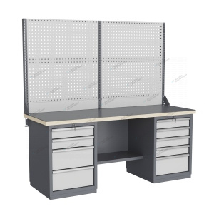 Тумбы и опоры верстаков выполнены из профилированной холоднокатаной стали и имеют сварную конструкцию. Возможна установка любых сочетаний тумб с различным количеством выдвижных ящиков, а также с дверцей и полками. Между тумбами и опорами возможна установка полки-стенки. На каждой ручке ящика и двери закреплен специальный алюминиевый профиль с отделением для установки маркировки. На тумбы с выдвижными ящиками установлена система антиопрокидывания, которая ограничивает выдвижение остальных ящиков тумбы, если один из ящиков выдвинут. Ящики снабжены специальными усиленными шариковыми направляющими. Тумбы снабжены центральной системой запирания. Столешница верстака изготавливается из шлифованной влагостойкой фанеры, которая покрыта лаком-антисептиком. Сверху на фанеру установлена стальная наладка. Верстак может комплектоваться одинарным или двойным перфорированным экраном, электромонтажным блоком для установки розеток и дополнительных устройств, а также комплектом освещения с держателем и лампой. Перфорация экрана подходит под стандартные держатели для инструментов, отверток, крючков, полок. Возможна комплектование верстака навесным элементами (держатели, крючки, полки). Все металлические части верстака покрыты ударопрочной и износостойкой порошковой краской. Возможна окраска верстака в любые цвета по каталогу RAL. Технические характеристики верстаков и рабочих столов: Характеристика Значение Максимальная масса груза, равномерно распределенного по рабочей поверхности столешницы, кг 1000 – 3000 (в зависимости от исполнения верстака или рабочего стола) Максимальная масса груза, распределенного по поверхности ящика 100 кг Максимальная масса груза, распределенного по поверхности полки 161 кг Максимально допустимая масса размещаемого груза на экране (при его наличии) 151 кг Максимально допустимая масса хранимого груза на навесной усиленной полке экрана 41 кг Глубина верстака, не более, мм 745 Фактическая глубина столешницы, мм 743 Толщина столешницы, мм 40 Толщина стальной накладки на столешницу, мм 5 Перфорация экрана, мм 12х12 Шаг перфорации экрана, мм 38 Основной стандартный цвет верстака Высокоглянцевое, гладкое покрытие RAL7024 Основной стандартный цвет экранов, лицевых панелей ящиков и дверей Высокоглянцевое, гладкое покрытие RAL7035 Преимущества серии: наличие в тумбах с ящиками специальной системы антиопрокидывания, которая ограничивает выдвижение остальных ящиков тумбы, если один из ящиков выдвинут, широкий выбор различных тумб позволяет получить более 50 различных вариантов верстаков и рабочих столов под любые задачи, применение в ящиках качественных усиленных шариковых направляющих полного выдвижения байонетного крепления, надежное крепление экранов, поскольку их кронштейны соединены со столешницей через заднюю балку верстаков, наличие блока коммуникаций, который может быть легко разработан под конкретные специальные требования, соответствие верстаков тяжелому классу по ГОСТ Р 58863-2020, уникальная конструкция держателя светильника, которая позволяет легко устанавливать светильник в удобном для работы положении. Комплектующие Столешница GTT205 (20.743.40.5) – 1шт. Балка GB3 (20.1992) – 1шт. Тумба G4 – 1шт. Тумба G5 – 1шт. Полка-стенка GSW4 (20.807) – 1шт. Усиленный кронштейн PKS (2.1110) – 3шт. Косынка кронштейна KCS – 2шт. Перфопанель QTP (20.93