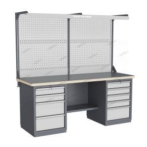 Тумбы и опоры верстаков выполнены из профилированной холоднокатаной стали и имеют сварную конструкцию. Возможна установка любых сочетаний тумб с различным количеством выдвижных ящиков, а также с дверцей и полками. Между тумбами и опорами возможна установка полки-стенки. На каждой ручке ящика и двери закреплен специальный алюминиевый профиль с отделением для установки маркировки. На тумбы с выдвижными ящиками установлена система антиопрокидывания, которая ограничивает выдвижение остальных ящиков тумбы, если один из ящиков выдвинут. Ящики снабжены специальными усиленными шариковыми направляющими. Тумбы снабжены центральной системой запирания. Столешница верстака изготавливается из шлифованной влагостойкой фанеры, которая покрыта лаком-антисептиком. Сверху на фанеру установлена стальная наладка. Верстак может комплектоваться одинарным или двойным перфорированным экраном, электромонтажным блоком для установки розеток и дополнительных устройств, а также комплектом освещения с держателем и лампой. Перфорация экрана подходит под стандартные держатели для инструментов, отверток, крючков, полок. Возможна комплектование верстака навесным элементами (держатели, крючки, полки). Все металлические части верстака покрыты ударопрочной и износостойкой порошковой краской. Возможна окраска верстака в любые цвета по каталогу RAL. Технические характеристики верстаков и рабочих столов: Характеристика Значение Максимальная масса груза, равномерно распределенного по рабочей поверхности столешницы, кг 1000 – 3000 (в зависимости от исполнения верстака или рабочего стола) Максимальная масса груза, распределенного по поверхности ящика 100 кг Максимальная масса груза, распределенного по поверхности полки 161 кг Максимально допустимая масса размещаемого груза на экране (при его наличии) 151 кг Максимально допустимая масса хранимого груза на навесной усиленной полке экрана 41 кг Глубина верстака, не более, мм 745 Фактическая глубина столешницы, мм 743 Толщина столешницы, мм 40 Толщина стальной накладки на столешницу, мм 5 Перфорация экрана, мм 12х12 Шаг перфорации экрана, мм 38 Основной стандартный цвет верстака Высокоглянцевое, гладкое покрытие RAL7024 Основной стандартный цвет экранов, лицевых панелей ящиков и дверей Высокоглянцевое, гладкое покрытие RAL7035 Преимущества серии: наличие в тумбах с ящиками специальной системы антиопрокидывания, которая ограничивает выдвижение остальных ящиков тумбы, если один из ящиков выдвинут, широкий выбор различных тумб позволяет получить более 50 различных вариантов верстаков и рабочих столов под любые задачи, применение в ящиках качественных усиленных шариковых направляющих полного выдвижения байонетного крепления, надежное крепление экранов, поскольку их кронштейны соединены со столешницей через заднюю балку верстаков, наличие блока коммуникаций, который может быть легко разработан под конкретные специальные требования, соответствие верстаков тяжелому классу по ГОСТ Р 58863-2020, уникальная конструкция держателя светильника, которая позволяет легко устанавливать светильник в удобном для работы положении. Комплектующие Столешница GTT205 (20.743.40.5) – 1шт. Балка GB3 (20.1992) – 1шт. Тумба G4 – 1шт. Тумба G5 – 1шт. Полка-стенка GSW4 (20.807) – 1шт. Усиленный кронштейн PKS (2.1110) – 3шт. Косынка кронштейна KCS – 2шт. Перфопанель QTP (20.93
