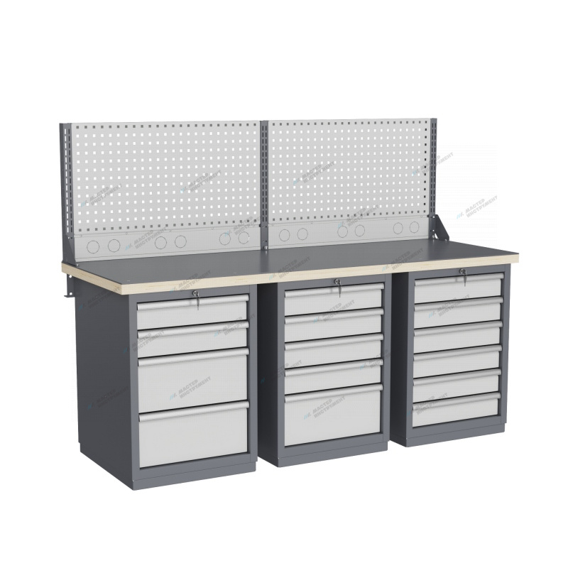 Тумбы и опоры верстаков выполнены из профилированной холоднокатаной стали и имеют сварную конструкцию. Возможна установка любых сочетаний тумб с различным количеством выдвижных ящиков, а также с дверцей и полками. Между тумбами и опорами возможна установка полки-стенки. На каждой ручке ящика и двери закреплен специальный алюминиевый профиль с отделением для установки маркировки. На тумбы с выдвижными ящиками установлена система антиопрокидывания, которая ограничивает выдвижение остальных ящиков тумбы, если один из ящиков выдвинут. Ящики снабжены специальными усиленными шариковыми направляющими. Тумбы снабжены центральной системой запирания. Столешница верстака изготавливается из шлифованной влагостойкой фанеры, которая покрыта лаком-антисептиком. Сверху на фанеру установлена стальная наладка. Верстак может комплектоваться одинарным или двойным перфорированным экраном, электромонтажным блоком для установки розеток и дополнительных устройств, а также комплектом освещения с держателем и лампой. Перфорация экрана подходит под стандартные держатели для инструментов, отверток, крючков, полок. Возможна комплектование верстака навесным элементами (держатели, крючки, полки). Все металлические части верстака покрыты ударопрочной и износостойкой порошковой краской. Возможна окраска верстака в любые цвета по каталогу RAL. Технические характеристики верстаков и рабочих столов: Характеристика Значение Максимальная масса груза, равномерно распределенного по рабочей поверхности столешницы, кг 1000 – 3000 (в зависимости от исполнения верстака или рабочего стола) Максимальная масса груза, распределенного по поверхности ящика 100 кг Максимальная масса груза, распределенного по поверхности полки 161 кг Максимально допустимая масса размещаемого груза на экране (при его наличии) 151 кг Максимально допустимая масса хранимого груза на навесной усиленной полке экрана 41 кг Глубина верстака, не более, мм 745 Фактическая глубина столешницы, мм 743 Толщина столешницы, мм 40 Толщина стальной накладки на столешницу, мм 5 Перфорация экрана, мм 12х12 Шаг перфорации экрана, мм 38 Основной стандартный цвет верстака Высокоглянцевое, гладкое покрытие RAL7024 Основной стандартный цвет экранов, лицевых панелей ящиков и дверей Высокоглянцевое, гладкое покрытие RAL7035 Преимущества серии: наличие в тумбах с ящиками специальной системы антиопрокидывания, которая ограничивает выдвижение остальных ящиков тумбы, если один из ящиков выдвинут, широкий выбор различных тумб позволяет получить более 50 различных вариантов верстаков и рабочих столов под любые задачи, применение в ящиках качественных усиленных шариковых направляющих полного выдвижения байонетного крепления, надежное крепление экранов, поскольку их кронштейны соединены со столешницей через заднюю балку верстаков, наличие блока коммуникаций, который может быть легко разработан под конкретные специальные требования, соответствие верстаков тяжелому классу по ГОСТ Р 58863-2020, уникальная конструкция держателя светильника, которая позволяет легко устанавливать светильник в удобном для работы положении. Комплектующие Столешница GTT205 (20.743.40.5) – 1шт. Балка GB3 (20.1992) – 1шт. Тумба G4 – 1шт. Тумба G5 – 1шт. Тумба G6 – 1шт. Усиленный кронштейн PKS (1.615) – 3шт. Косынка кронштейна KCS – 2шт. Перфопанель QTP (20.930) – 2шт. Блок к