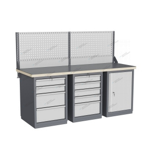 Тумбы и опоры верстаков выполнены из профилированной холоднокатаной стали и имеют сварную конструкцию. Возможна установка любых сочетаний тумб с различным количеством выдвижных ящиков, а также с дверцей и полками. Между тумбами и опорами возможна установка полки-стенки. На каждой ручке ящика и двери закреплен специальный алюминиевый профиль с отделением для установки маркировки. На тумбы с выдвижными ящиками установлена система антиопрокидывания, которая ограничивает выдвижение остальных ящиков тумбы, если один из ящиков выдвинут. Ящики снабжены специальными усиленными шариковыми направляющими. Тумбы снабжены центральной системой запирания. Столешница верстака изготавливается из шлифованной влагостойкой фанеры, которая покрыта лаком-антисептиком. Сверху на фанеру установлена стальная наладка. Верстак может комплектоваться одинарным или двойным перфорированным экраном, электромонтажным блоком для установки розеток и дополнительных устройств, а также комплектом освещения с держателем и лампой. Перфорация экрана подходит под стандартные держатели для инструментов, отверток, крючков, полок. Возможна комплектование верстака навесным элементами (держатели, крючки, полки). Все металлические части верстака покрыты ударопрочной и износостойкой порошковой краской. Возможна окраска верстака в любые цвета по каталогу RAL. Технические характеристики верстаков и рабочих столов: Характеристика Значение Максимальная масса груза, равномерно распределенного по рабочей поверхности столешницы, кг 1000 – 3000 (в зависимости от исполнения верстака или рабочего стола) Максимальная масса груза, распределенного по поверхности ящика 100 кг Максимальная масса груза, распределенного по поверхности полки 161 кг Максимально допустимая масса размещаемого груза на экране (при его наличии) 151 кг Максимально допустимая масса хранимого груза на навесной усиленной полке экрана 41 кг Глубина верстака, не более, мм 745 Фактическая глубина столешницы, мм 743 Толщина столешницы, мм 40 Толщина стальной накладки на столешницу, мм 5 Перфорация экрана, мм 12х12 Шаг перфорации экрана, мм 38 Основной стандартный цвет верстака Высокоглянцевое, гладкое покрытие RAL7024 Основной стандартный цвет экранов, лицевых панелей ящиков и дверей Высокоглянцевое, гладкое покрытие RAL7035 Преимущества серии: наличие в тумбах с ящиками специальной системы антиопрокидывания, которая ограничивает выдвижение остальных ящиков тумбы, если один из ящиков выдвинут, широкий выбор различных тумб позволяет получить более 50 различных вариантов верстаков и рабочих столов под любые задачи, применение в ящиках качественных усиленных шариковых направляющих полного выдвижения байонетного крепления, надежное крепление экранов, поскольку их кронштейны соединены со столешницей через заднюю балку верстаков, наличие блока коммуникаций, который может быть легко разработан под конкретные специальные требования, соответствие верстаков тяжелому классу по ГОСТ Р 58863-2020, уникальная конструкция держателя светильника, которая позволяет легко устанавливать светильник в удобном для работы положении. Комплектующие Столешница GTT205 (20.743.40.5) – 1шт. Балка GB3 (20.1992) – 1шт. Тумба G4 – 1шт. Тумба G5 – 1шт. Тумба G7 – 1шт. Усиленный кронштейн PKS (1.615) – 3шт. Косынка кронштейна KCS – 2шт. Перфопанель QTP (20.930) – 2шт. Панел