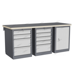 Тумбы и опоры верстаков выполнены из профилированной холоднокатаной стали и имеют сварную конструкцию. Возможна установка любых сочетаний тумб с различным количеством выдвижных ящиков, а также с дверцей и полками. Между тумбами и опорами возможна установка полки-стенки. На каждой ручке ящика и двери закреплен специальный алюминиевый профиль с отделением для установки маркировки. На тумбы с выдвижными ящиками установлена система антиопрокидывания, которая ограничивает выдвижение остальных ящиков тумбы, если один из ящиков выдвинут. Ящики снабжены специальными усиленными шариковыми направляющими. Тумбы снабжены центральной системой запирания. Столешница верстака изготавливается из шлифованной влагостойкой фанеры, которая покрыта лаком-антисептиком. Сверху на фанеру установлена стальная наладка. Верстак может комплектоваться одинарным или двойным перфорированным экраном, электромонтажным блоком для установки розеток и дополнительных устройств, а также комплектом освещения с держателем и лампой. Перфорация экрана подходит под стандартные держатели для инструментов, отверток, крючков, полок. Возможна комплектование верстака навесным элементами (держатели, крючки, полки). Все металлические части верстака покрыты ударопрочной и износостойкой порошковой краской. Возможна окраска верстака в любые цвета по каталогу RAL. Технические характеристики верстаков и рабочих столов: Характеристика Значение Максимальная масса груза, равномерно распределенного по рабочей поверхности столешницы, кг 1000 – 3000 (в зависимости от исполнения верстака или рабочего стола) Максимальная масса груза, распределенного по поверхности ящика 100 кг Максимальная масса груза, распределенного по поверхности полки 161 кг Максимально допустимая масса размещаемого груза на экране (при его наличии) 151 кг Максимально допустимая масса хранимого груза на навесной усиленной полке экрана 41 кг Глубина верстака, не более, мм 745 Фактическая глубина столешницы, мм 743 Толщина столешницы, мм 40 Толщина стальной накладки на столешницу, мм 5 Перфорация экрана, мм 12х12 Шаг перфорации экрана, мм 38 Основной стандартный цвет верстака Высокоглянцевое, гладкое покрытие RAL7024 Основной стандартный цвет экранов, лицевых панелей ящиков и дверей Высокоглянцевое, гладкое покрытие RAL7035 Преимущества серии: наличие в тумбах с ящиками специальной системы антиопрокидывания, которая ограничивает выдвижение остальных ящиков тумбы, если один из ящиков выдвинут, широкий выбор различных тумб позволяет получить более 50 различных вариантов верстаков и рабочих столов под любые задачи, применение в ящиках качественных усиленных шариковых направляющих полного выдвижения байонетного крепления, надежное крепление экранов, поскольку их кронштейны соединены со столешницей через заднюю балку верстаков, наличие блока коммуникаций, который может быть легко разработан под конкретные специальные требования, соответствие верстаков тяжелому классу по ГОСТ Р 58863-2020, уникальная конструкция держателя светильника, которая позволяет легко устанавливать светильник в удобном для работы положении. Комплектующие Столешница GTT205 (20.743.40.5) – 1шт. Балка GB3 (20.1992) – 1шт. Тумба G4 – 1шт. Тумба G5 – 1шт. Тумба G7 – 1шт. Характеристики **Габариты и вес товара с упаковкой Общий вес с упаковкой - 0 кг Упаковка Разме