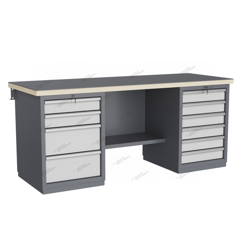 Верстаки и рабочие столы серии GRAND: предназначены для выполнения тяжелых сборочных, слесарных и других видов работ на производстве, для установки в закрытых помещениях, выпускаются по ГОСТ Р 58863-2020 и относятся к верстакам тяжелого класса представляют собой сборно-разборную модульную конструкцию и состоят из тумб или опор, связанных задней балкой, к которым крепится столешница рабочие столы выполняются в бестумбовом исполнении верстаки могут выполняться в однотумбовом, двухтумбовом и трехтумбовом исполнениях Тумбы и опоры верстаков выполнены из профилированной холоднокатаной стали и имеют сварную конструкцию. Возможна установка любых сочетаний тумб с различным количеством выдвижных ящиков, а также с дверцей и полками. Между тумбами и опорами возможна установка полки-стенки. На каждой ручке ящика и двери закреплен специальный алюминиевый профиль с отделением для установки маркировки. На тумбы с выдвижными ящиками установлена система антиопрокидывания, которая ограничивает выдвижение остальных ящиков тумбы, если один из ящиков выдвинут. Ящики снабжены специальными усиленными шариковыми направляющими. Тумбы снабжены центральной системой запирания. Столешница верстака изготавливается из шлифованной влагостойкой фанеры, которая покрыта лаком-антисептиком. Сверху на фанеру установлена стальная наладка. Верстак может комплектоваться одинарным или двойным перфорированным экраном, электромонтажным блоком для установки розеток и дополнительных устройств, а также комплектом освещения с держателем и лампой. Перфорация экрана подходит под стандартные держатели для инструментов, отверток, крючков, полок. Возможна комплектование верстака навесным элементами (держатели, крючки, полки). Все металлические части верстака покрыты ударопрочной и износостойкой порошковой краской. Возможна окраска верстака в любые цвета по каталогу RAL. Технические характеристики верстаков и рабочих столов: Характеристика Значение Максимальная масса груза, равномерно распределенного по рабочей поверхности столешницы, кг 1000 – 3000 (в зависимости от исполнения верстака или рабочего стола) Максимальная масса груза, распределенного по поверхности ящика 100 кг Максимальная масса груза, распределенного по поверхности полки 161 кг Максимально допустимая масса размещаемого груза на экране (при его наличии) 151 кг Максимально допустимая масса хранимого груза на навесной усиленной полке экрана 41 кг Глубина верстака, не более, мм 745 Фактическая глубина столешницы, мм 743 Толщина столешницы, мм 40 Толщина стальной накладки на столешницу, мм 5 Перфорация экрана, мм 12х12 Шаг перфорации экрана, мм 38 Основной стандартный цвет верстака Высокоглянцевое, гладкое покрытие RAL7024 Основной стандартный цвет экранов, лицевых панелей ящиков и дверей Высокоглянцевое, гладкое покрытие RAL7035 Преимущества серии: наличие в тумбах с ящиками специальной системы антиопрокидывания, которая ограничивает выдвижение остальных ящиков тумбы, если один из ящиков выдвинут, широкий выбор различных тумб позволяет получить более 50 различных вариантов верстаков и рабочих столов под любые задачи, применение в ящиках качественных усиленных шариковых направляющих полного выдвижения байонетного крепления, надежное крепление экранов, поскольку их кронштейны соединены со столешницей 