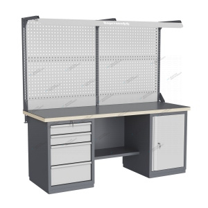 Тумбы и опоры верстаков выполнены из профилированной холоднокатаной стали и имеют сварную конструкцию. Возможна установка любых сочетаний тумб с различным количеством выдвижных ящиков, а также с дверцей и полками. Между тумбами и опорами возможна установка полки-стенки. На каждой ручке ящика и двери закреплен специальный алюминиевый профиль с отделением для установки маркировки. На тумбы с выдвижными ящиками установлена система антиопрокидывания, которая ограничивает выдвижение остальных ящиков тумбы, если один из ящиков выдвинут. Ящики снабжены специальными усиленными шариковыми направляющими. Тумбы снабжены центральной системой запирания. Столешница верстака изготавливается из шлифованной влагостойкой фанеры, которая покрыта лаком-антисептиком. Сверху на фанеру установлена стальная наладка. Верстак может комплектоваться одинарным или двойным перфорированным экраном, электромонтажным блоком для установки розеток и дополнительных устройств, а также комплектом освещения с держателем и лампой. Перфорация экрана подходит под стандартные держатели для инструментов, отверток, крючков, полок. Возможна комплектование верстака навесным элементами (держатели, крючки, полки). Все металлические части верстака покрыты ударопрочной и износостойкой порошковой краской. Возможна окраска верстака в любые цвета по каталогу RAL. Технические характеристики верстаков и рабочих столов: Характеристика Значение Максимальная масса груза, равномерно распределенного по рабочей поверхности столешницы, кг 1000 – 3000 (в зависимости от исполнения верстака или рабочего стола) Максимальная масса груза, распределенного по поверхности ящика 100 кг Максимальная масса груза, распределенного по поверхности полки 161 кг Максимально допустимая масса размещаемого груза на экране (при его наличии) 151 кг Максимально допустимая масса хранимого груза на навесной усиленной полке экрана 41 кг Глубина верстака, не более, мм 745 Фактическая глубина столешницы, мм 743 Толщина столешницы, мм 40 Толщина стальной накладки на столешницу, мм 5 Перфорация экрана, мм 12х12 Шаг перфорации экрана, мм 38 Основной стандартный цвет верстака Высокоглянцевое, гладкое покрытие RAL7024 Основной стандартный цвет экранов, лицевых панелей ящиков и дверей Высокоглянцевое, гладкое покрытие RAL7035 Преимущества серии: наличие в тумбах с ящиками специальной системы антиопрокидывания, которая ограничивает выдвижение остальных ящиков тумбы, если один из ящиков выдвинут, широкий выбор различных тумб позволяет получить более 50 различных вариантов верстаков и рабочих столов под любые задачи, применение в ящиках качественных усиленных шариковых направляющих полного выдвижения байонетного крепления, надежное крепление экранов, поскольку их кронштейны соединены со столешницей через заднюю балку верстаков, наличие блока коммуникаций, который может быть легко разработан под конкретные специальные требования, соответствие верстаков тяжелому классу по ГОСТ Р 58863-2020, уникальная конструкция держателя светильника, которая позволяет легко устанавливать светильник в удобном для работы положении. Комплектующие Столешница GTT205 (20.743.40.5) – 1шт. Балка GB3 (20.1992) – 1шт. Тумба G4 – 1шт. Тумба G7 – 1шт. Полка-стенка GSW4 (20.807) – 1шт. Усиленный кронштейн PKS (2.1110) – 3шт. Косынка кронштейна KCS – 2шт. Перфопанель QTP (20.93