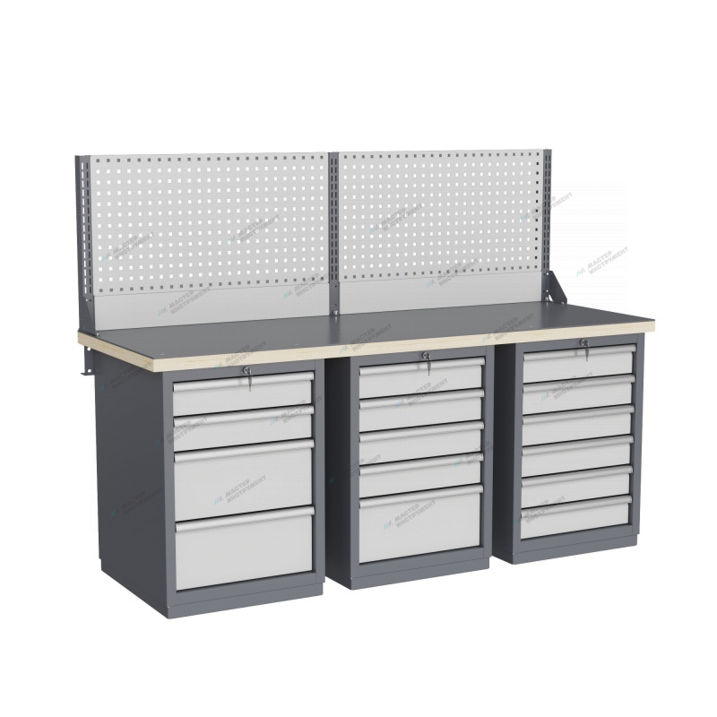 Тумбы и опоры верстаков выполнены из профилированной холоднокатаной стали и имеют сварную конструкцию. Возможна установка любых сочетаний тумб с различным количеством выдвижных ящиков, а также с дверцей и полками. Между тумбами и опорами возможна установка полки-стенки. На каждой ручке ящика и двери закреплен специальный алюминиевый профиль с отделением для установки маркировки. На тумбы с выдвижными ящиками установлена система антиопрокидывания, которая ограничивает выдвижение остальных ящиков тумбы, если один из ящиков выдвинут. Ящики снабжены специальными усиленными шариковыми направляющими. Тумбы снабжены центральной системой запирания. Столешница верстака изготавливается из шлифованной влагостойкой фанеры, которая покрыта лаком-антисептиком. Сверху на фанеру установлена стальная наладка. Верстак может комплектоваться одинарным или двойным перфорированным экраном, электромонтажным блоком для установки розеток и дополнительных устройств, а также комплектом освещения с держателем и лампой. Перфорация экрана подходит под стандартные держатели для инструментов, отверток, крючков, полок. Возможна комплектование верстака навесным элементами (держатели, крючки, полки). Все металлические части верстака покрыты ударопрочной и износостойкой порошковой краской. Возможна окраска верстака в любые цвета по каталогу RAL. Технические характеристики верстаков и рабочих столов: Характеристика Значение Максимальная масса груза, равномерно распределенного по рабочей поверхности столешницы, кг 1000 – 3000 (в зависимости от исполнения верстака или рабочего стола) Максимальная масса груза, распределенного по поверхности ящика 100 кг Максимальная масса груза, распределенного по поверхности полки 161 кг Максимально допустимая масса размещаемого груза на экране (при его наличии) 151 кг Максимально допустимая масса хранимого груза на навесной усиленной полке экрана 41 кг Глубина верстака, не более, мм 745 Фактическая глубина столешницы, мм 743 Толщина столешницы, мм 40 Толщина стальной накладки на столешницу, мм 5 Перфорация экрана, мм 12х12 Шаг перфорации экрана, мм 38 Основной стандартный цвет верстака Высокоглянцевое, гладкое покрытие RAL7024 Основной стандартный цвет экранов, лицевых панелей ящиков и дверей Высокоглянцевое, гладкое покрытие RAL7035 Преимущества серии: наличие в тумбах с ящиками специальной системы антиопрокидывания, которая ограничивает выдвижение остальных ящиков тумбы, если один из ящиков выдвинут, широкий выбор различных тумб позволяет получить более 50 различных вариантов верстаков и рабочих столов под любые задачи, применение в ящиках качественных усиленных шариковых направляющих полного выдвижения байонетного крепления, надежное крепление экранов, поскольку их кронштейны соединены со столешницей через заднюю балку верстаков, наличие блока коммуникаций, который может быть легко разработан под конкретные специальные требования, соответствие верстаков тяжелому классу по ГОСТ Р 58863-2020, уникальная конструкция держателя светильника, которая позволяет легко устанавливать светильник в удобном для работы положении. Комплектующие Столешница GTT205 (20.743.40.5) – 1шт. Балка GB3 (20.1992) – 1шт. Тумба G4 – 1шт. Тумба G5 – 1шт. Тумба G6 – 1шт. Усиленный кронштейн PKS (1.615) – 3шт. Косынка кронштейна KCS – 2шт. Перфопанель QTP (20.930) – 2шт. Панел