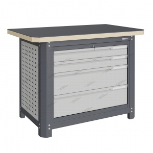 Верстак серии MECHANIC: MCN 1252.L4 состоит из столешницы шириной 1193 мм, рамы верстака, состоящей из опор, перемычек, боковых перфопанелей, большого модуля L4. Предназначен для выполнения сборочных, ремонтных, слесарных, монтажных и других видов работ на производстве, в сервисных центрах, мастерских, гаражах. Рама верстака выполнена их холоднокатаной стали. Опоры допускают частичную регулировку по высоте для компенсации неровности пола. Все металлические элементы покрыты полиэфирной порошковой краской, обеспечивающей хорошую износостойкость покрытия и невосприимчивость его к моющим средствам и смазочным веществам. Верстак имеет декларацию соответствия ТР ТС 025/2012 «О безопасности мебельной продукции». Верстак имеет сертификат соответствия ГОСТ Р 58863-2020 «Столы производственные. Верстаки из металла. Общие технические условия». Столешница состоит из листа влагостойкой фанеры марки ФСФ толщиной 40 мм, которая покрыта лаком-антисептиком и листом горячекатаной стали толщиной 5 мм. Глубина столешниц 743 мм. Максимальная масса груза, равномерно распределенного по столешнице, составляет 1500 кг. Модуль верстака выполнен сварными. Ящики в модулях устанавливаются на шариковых телескопических направляющих полного выдвижения. В модуле L4 установлено два малых ящика и два больших ящика. Внутренние размеры малых ящиков (ВхШхГ), не более: 75 х 755 х 500 мм. Внутренние размеры больших ящиков (ВхШхГ), не более: 172 х 755 х 500 мм. Максимально допустимая масса груза, равномерно распределенного по поверхности любого выдвижного ящика 31 кг. Модули с ящиками снабжены общим центральным замком с поворотом ригеля 180 градусов и подпружиненной тягой. В комплекте два ключа для каждого замка. Квадратная перфорация на элементах верстака предназначена для установки крючков, держателей и других аксессуаров, имеет размеры: квадрат 12х12мм. шаг 38мм. Характеристики **Габариты и вес товара с упаковкой Общий вес с упаковкой - 0 кг Упаковка Размеры упаковки (Д*Ш*В), мм Вес, кг Упаковка №1 x x 0 ** Теоретический вес