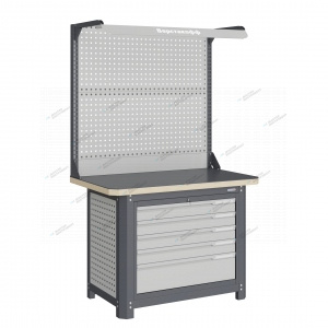 Рама верстака выполнена их холоднокатаной стали. Опоры допускают частичную регулировку по высоте для компенсации неровности пола. Все металлические элементы покрыты полиэфирной порошковой краской, обеспечивающей хорошую износостойкость покрытия и невосприимчивость его к моющим средствам и смазочным веществам. Верстак имеет декларацию соответствия ТР ТС 025/2012 «О безопасности мебельной продукции». Верстак имеет сертификат соответствия ГОСТ Р 58863-2020 «Столы производственные. Верстаки из металла. Общие технические условия». Столешница состоит из листа влагостойкой фанеры марки ФСФ толщиной 40 мм, которая покрыта лаком-антисептиком и листом горячекатаной стали толщиной 5 мм. Глубина столешниц 743 мм. Максимальная масса груза, равномерно распределенного по столешнице, составляет 1500 кг. Модуль верстака выполнен сварными. Ящики в модулях устанавливаются на шариковых телескопических направляющих полного выдвижения. В модуле L5 установлено четыре малых ящика и один большой ящик. Внутренние размеры малых ящиков (ВхШхГ), не более: 75 х 755 х 500 мм. Внутренние размеры больших ящиков (ВхШхГ), не более: 172 х 755 х 500 мм. Максимально допустимая масса груза, равномерно распределенного по поверхности любого выдвижного ящика 31 кг. Модули с ящиками снабжены общим центральным замком с поворотом ригеля 180 градусов и подпружиненной тягой. В комплекте два ключа для каждого замка. Квадратная перфорация на элементах верстака предназначена для установки крючков, держателей и других аксессуаров, имеет размеры: квадрат 12х12мм. шаг 38мм. Экран (перфорированная панель) верстака выполнен с квадратной перфорацией 12х12 мм с шагом 38 мм для установки крючков, держателей и других аксессуаров. Экран крепятся к столешнице с помощью специальных кронштейнов. Максимальная масса груза, равномерно распределенного по поверхности экрана, составляет 71 кг. Комплект освещения устанавливается над верстаком. В комплекте идет защитный козырек, кронштейны и лампа с магнитными креплениями, которые позволяют менять ее положение. Характеристики **Габариты и вес товара с упаковкой Общий вес с упаковкой - 0 кг Упаковка Размеры упаковки (Д*Ш*В), мм Вес, кг Упаковка №1 x x 0 ** Теоретический вес
