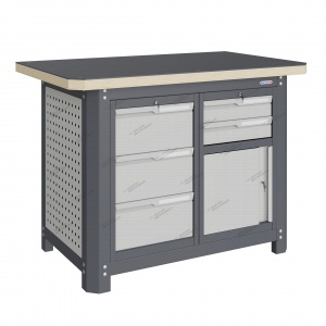 Рама верстака выполнена их холоднокатаной стали. Опоры допускают частичную регулировку по высоте для компенсации неровности пола. Все металлические элементы покрыты полиэфирной порошковой краской, обеспечивающей хорошую износостойкость покрытия и невосприимчивость его к моющим средствам и смазочным веществам. Верстак имеет декларацию соответствия ТР ТС 025/2012 «О безопасности мебельной продукции». Верстак имеет сертификат соответствия ГОСТ Р 58863-2020 «Столы производственные. Верстаки из металла. Общие технические условия». Столешница состоит из листа влагостойкой фанеры марки ФСФ толщиной 40 мм, которая покрыта лаком-антисептиком и листом горячекатаной стали толщиной 5 мм. Глубина столешниц 743 мм. Максимальная масса груза, равномерно распределенного по столешнице, составляет 1500 кг. Модуль верстака выполнен сварными. Ящики в модулях устанавливаются на шариковых телескопических направляющих полного выдвижения. В модуле S3 установлено три больших ящика. Внутренние размеры больших ящиков (ВхШхГ), не более: 172 х 340 х 500 мм. Максимально допустимая масса груза, равномерно распределенного по поверхности любого выдвижного ящика 31 кг. В модуле S9 установлено два малых ящика, дверь и одна полка. Внутренние размеры малого ящика (ВхШхГ), не более: 75 х 340 х 500 мм. Дверь имеет размеры (ВхШхГ), не более: 346 х 367 х 25 мм. Полка модуля имеет размеры (ВхШхГ), не более: 25 х 367 х 510 мм. Максимально допустимая масса груза, равномерно распределенного по поверхности любого выдвижного ящика и полки 31 кг. Модули с ящиками снабжены общим центральным замком с поворотом ригеля 180 градусов и подпружиненной тягой. В комплекте два ключа для каждого замка. Квадратная перфорация на элементах верстака предназначена для установки крючков, держателей и других аксессуаров, имеет размеры: квадрат 12х12мм. шаг 38мм. Характеристики **Габариты и вес товара с упаковкой Общий вес с упаковкой - 0 кг Упаковка Размеры упаковки (Д*Ш*В), мм Вес, кг Упаковка №1 x x 0 ** Теоретический вес