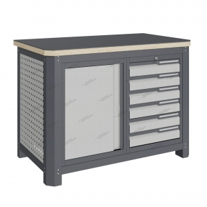 Рама верстака выполнена их холоднокатаной стали. Опоры допускают частичную регулировку по высоте для компенсации неровности пола. Все металлические элементы покрыты полиэфирной порошковой краской, обеспечивающей хорошую износостойкость покрытия и невосприимчивость его к моющим средствам и смазочным веществам. Верстак имеет декларацию соответствия ТР ТС 025/2012 «О безопасности мебельной продукции». Верстак имеет сертификат соответствия ГОСТ Р 58863-2020 «Столы производственные. Верстаки из металла. Общие технические условия». Столешница состоит из листа влагостойкой фанеры марки ФСФ толщиной 40 мм, которая покрыта лаком-антисептиком и листом горячекатаной стали толщиной 5 мм. Глубина столешниц 743 мм. Максимальная масса груза, равномерно распределенного по столешнице, составляет 1500 кг. Модуль верстака выполнен сварными. Ящики в модулях устанавливаются на шариковых телескопических направляющих полного выдвижения. В модуле S6 установлено шесть малых ящиков. Внутренние размеры малых ящиков (ВхШхГ), не более: 75 х 340 х 500 мм. Максимально допустимая масса груза, равномерно распределенного по поверхности любого выдвижного ящика 31 кг. В модуле S7 установлена дверь и две полки. Дверь имеет размеры (ВхШхГ), не более: 578 х 367 х 25 мм. Полка модуля имеет размеры (ВхШхГ), не более: 25 х 367 х 510 мм. Максимально допустимая масса груза, равномерно распределенного по поверхности полки 31 кг. Модули с ящиками снабжены общим центральным замком с поворотом ригеля 180 градусов и подпружиненной тягой. В комплекте два ключа для каждого замка. Квадратная перфорация на элементах верстака предназначена для установки крючков, держателей и других аксессуаров, имеет размеры: квадрат 12х12мм. шаг 38мм. Характеристики **Габариты и вес товара с упаковкой Общий вес с упаковкой - 0 кг Упаковка Размеры упаковки (Д*Ш*В), мм Вес, кг Упаковка №1 x x 0 ** Теоретический вес